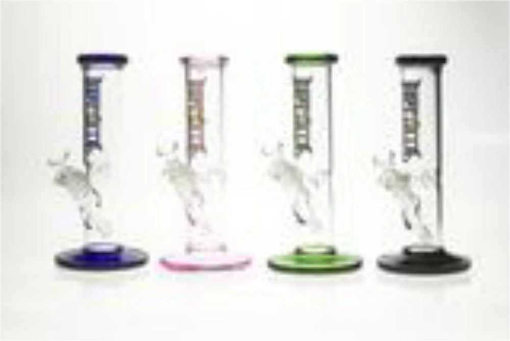 This sturdy Slimmzilla bong by Dopezilla looks awesome and provides great hits. The Slimzilla is made from quality borosilicate glass and measures 25.4 cm / 10 inches in height. It features colored accents on the foot and mouthpiece. It also features a colored Dopzilla logo on the straight tube. The Slimzilla comes delivered with an inside-cut 18.8mm > 14.5mm slitted diffuser downstem and a male 14.5mm herb bowl with handle. The handle makes it easy to lift the bowl, and it doubles as the perfect roll stopper as well. The bullet-hole ice pinch allows you to place a few ice cubes in the top of the tube for that extra bit of cooling of the smoke that makes all the difference.