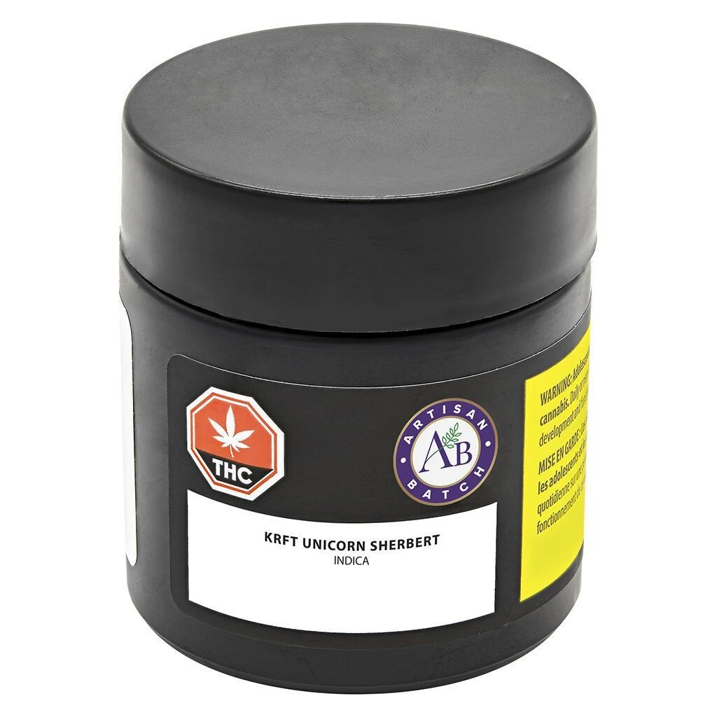 Artisan Batch prides itself on taking local growers from across Canada and giving them national exposure. KRFT Cannabis Unicorn Sherbert is grown in a 5,000 sq.ft facility in rural Newfoundland, designed specifically for small-batch growing. For over five years, KRFT Cannabis has been improving and innovating their growing process, resulting in rare, high-potency strains with exceptional terpene profiles. KRFT Cannabis is grown hydroponically in Eazy Grow coco pyramids, then hung to dry and cold cured for optimal results. KRFT cures its cannabis for 21 days, burping the strains daily. Once they’re ready to be trimmed, it’s done so with care to ensure the best possible product. Unicorn Sherbert has dense, frosty buds that are heavily resinated with purple hues and dark orange hairs. The indica-dominant strain has 3.47% terpenes—predominantly limonene, caryophyllene, and myrcene. KRFT Cannabis uniquely phenohunts strains that set the bar high for premium cannabis in Canada.