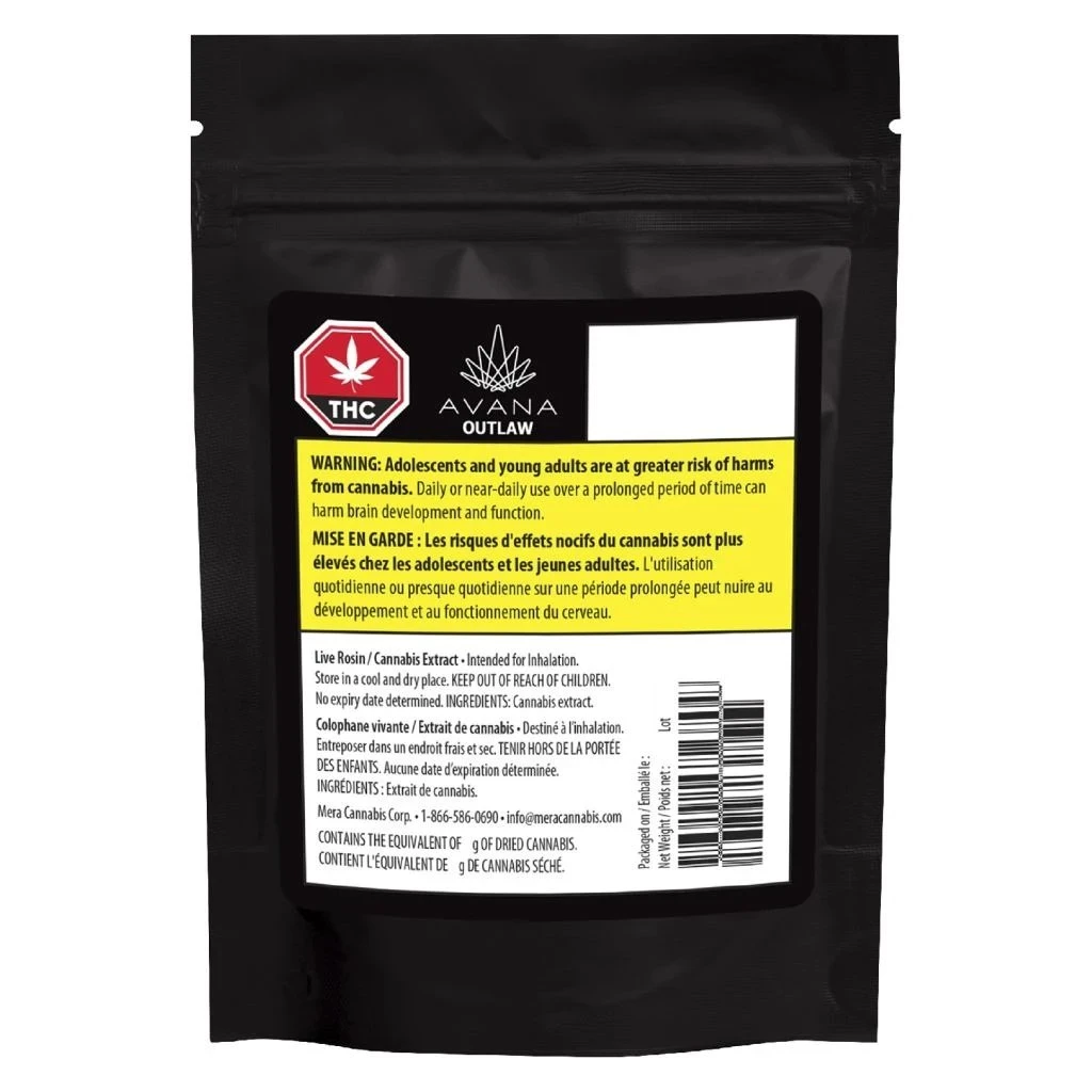 Avana Outlaw Live Rosin is a single input, solventless full-spectrum extract produced from soil-to-oil in St. Thomas, Ontario. Outlaw’s terpene content comes in at 9-12%, with high levels of caryophyllene, farnesene and limonene. We hand harvest our sun-grown cannabis plants and immediately freeze them (called Whole Plant Fresh Frozen, or WPFF). Trichomes are separated in ice water using a careful agitation process, and the water hash is gently pressed into rosin through 37u bags. Avana hand packages our rosin in square glass pods sealed with an industry-leading airtight FEP anti-stick liner and multi-shot TPE gasket. We recommend storing Avana Outlaw Live Rosin in the fridge and removing it a minimum of 30 minutes before opening to reduce condensation and bring the rosin to its truest representation at room temperature. We recommend dabbing Avana Outlaw Live Rosin between 450°F and 500°F.