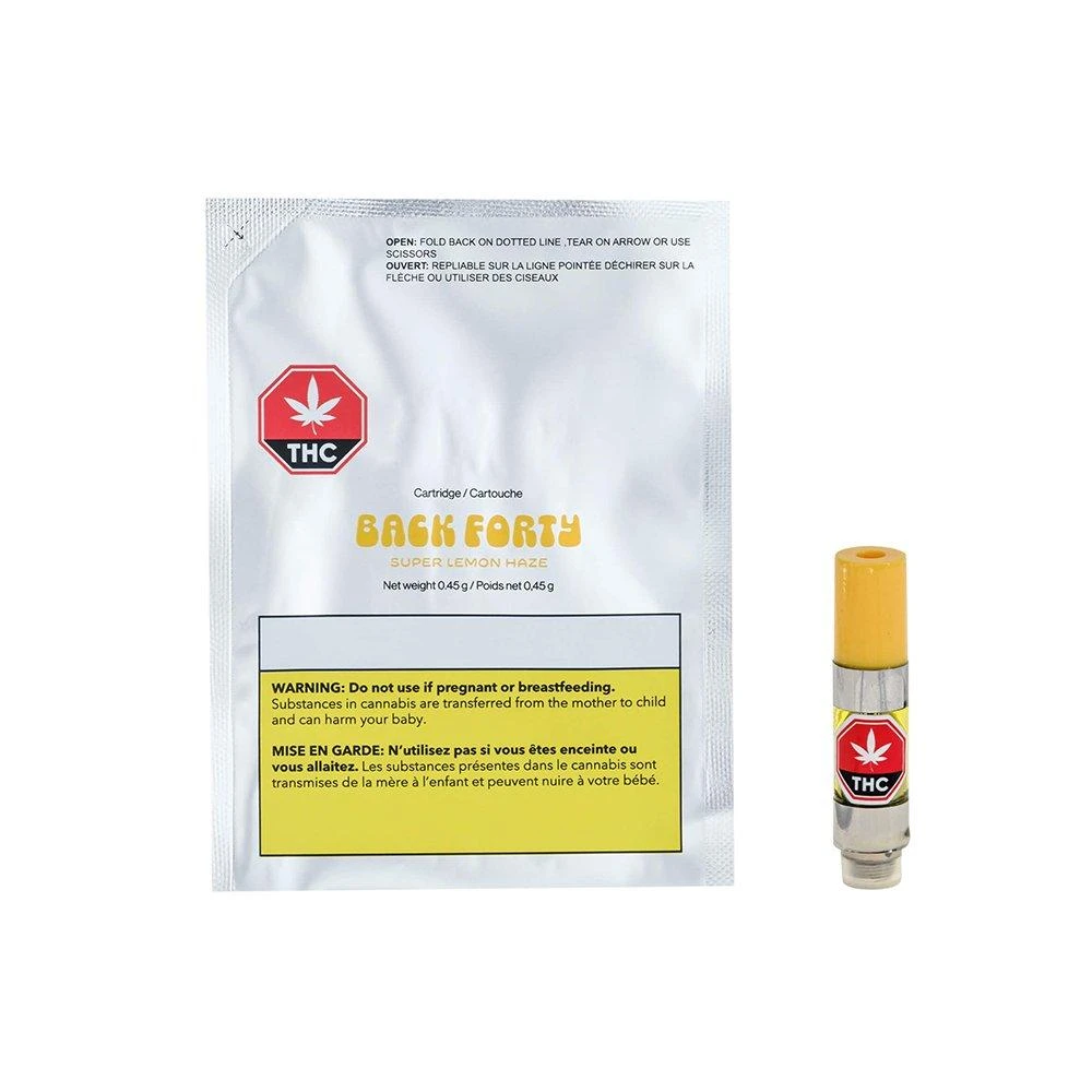 Back Forty Super Lemon Haze Sativa strain has a tangy, citrus burst of flavour with subtle herbal undertones; the main terpenes are limonene and terpinolene. This high potency vape has 800 mg of THC and 0 mg of CBD per 1.0g cartridge and has no fillers. Perfect for your Back Forty Adventures. Compatible with 510 thread devices. Device not included.