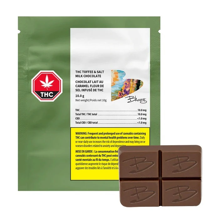 Bhang® THC Toffee & Salt Milk Chocolate combines 48% cocoa and THC scored into four pieces. Savour the cannabis-free flavour of creamy milk chocolate sprinkled with sea salt and 10mg of THC per bar.