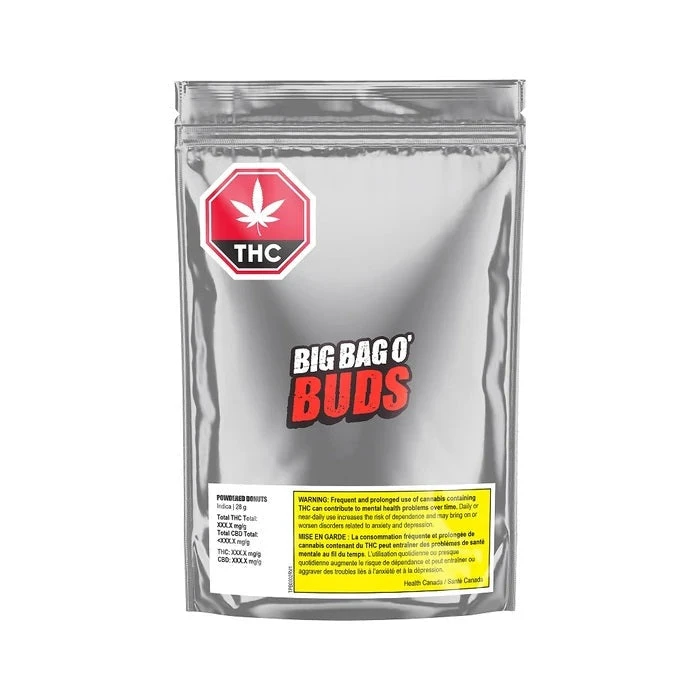 Big Buds. Big Terps. Big Bag. Not all flower is worthy of an ounce, except Big Bag. Powdered Donuts is an indica-dominant strain with a mid-to-high THC potency and is a cross of Orange Cookies x Jet Fuel Gelato. This bud has a sweet, fruity and diesel aroma that combine to create a smell of fresh, sugary, jelly-filled donuts. This unique aroma is the result of a terpene blend consisting of Myrcene, Caryophyllene, Limonene, Linalool, Humulene. Its light-density, mountain-shaped buds have a full foliage.
