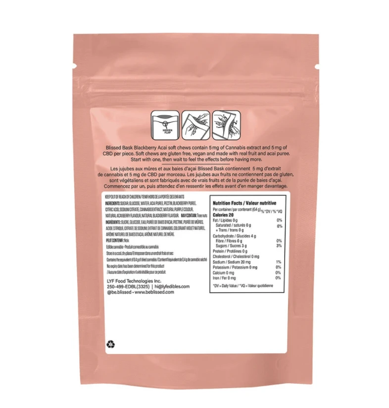 Blissed Bask Blackberry Acai fruit are chew 1:1 ratio soft chews that offer a fruity burst of flavour. Blissed soft chews are made from high quality ingredients and contain real fruit and acai puree. A smoke free way to consume cannabis, each piece is infused with cannabis distillate to remove any noticeable cannabis taste and smell. Each package contains 2 soft chews thoughtfully formulated with 5 mg of THC and 5 mg of CBD so you can start low and go slow. Developed in British Columbia, our soft chews have gone through rigorous testing to ensure a high-quality, and consistent experience. 10% of the profits from Blissed go to organizations that support gender equality.