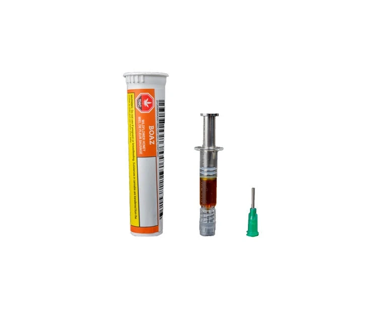 BOAZ Wildflower Honey is a true and traditional full-spectrum extract of high THC, from a CO2-extract process, which allows the solution to naturally occur without the use of any harmful chemicals or artificial terpenes. Made with a select blend of handcrafted THC strains, expect a high potency with this hybrid blend. The glass and metal syringe allows BOAZ Wildflower Honey to be consumed by dabbing, rolling, filling, vaping or infusing.