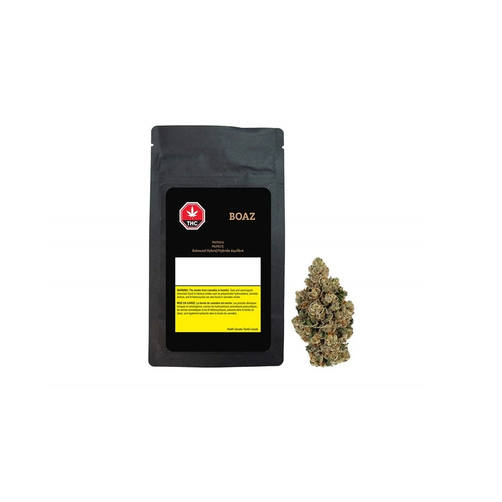BOAZ Craft Cannabis premium Papaya Pi flower is always true to our tradition, only quad buds, hand trimmed, hand packaged with no Kief removed. Handcrafted Papaya Pi is an indica-dominant hybrid strain, a cross of Orange Cookies and Jet Fuel Gelato. Papaya Pi exhibits a tangy aroma and a taste of sweet papaya and citrus. Tight, dense light minty green colored flower showcases the sparkling white crystal trichomes. Our handcrafted batches are grown in customized modular grow pods to ensure perfect growing conditions, then carefully hang dried, hand trimmed with a 30-day cold cure to ensure our high standards are met.