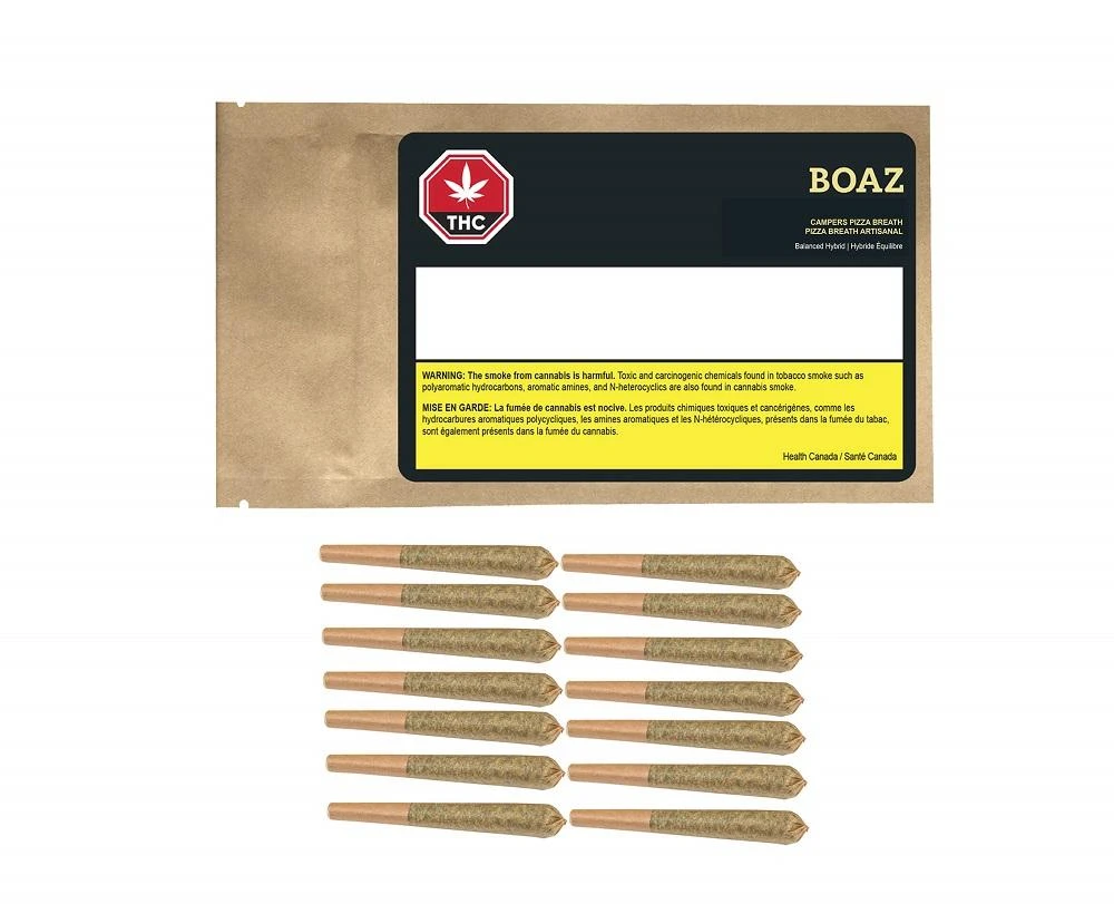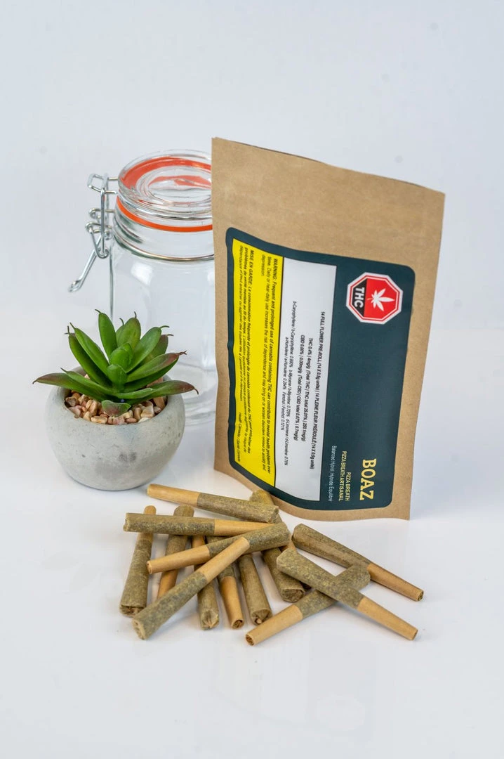 BOAZ Craft Cannabis premium flower pre-rolls are always made with full buds. Each pre-roll is crafted by hand from being filled, rolled and packaged. Handcrafted Pizza Breath is a true 50-50 hybrid that is a cross of GMO Cookies and (Zkittlez and OG Kush). A great strain for nighttime vibes. Our Pizza Breath has an aroma of onions, mushroom and garlic with a flavour that is earthy and peppery. The buds are tight, minty green with lilac undertones. Sparkling with dark orange hairs and a coating of lilac-tinted white crystal trichomes.