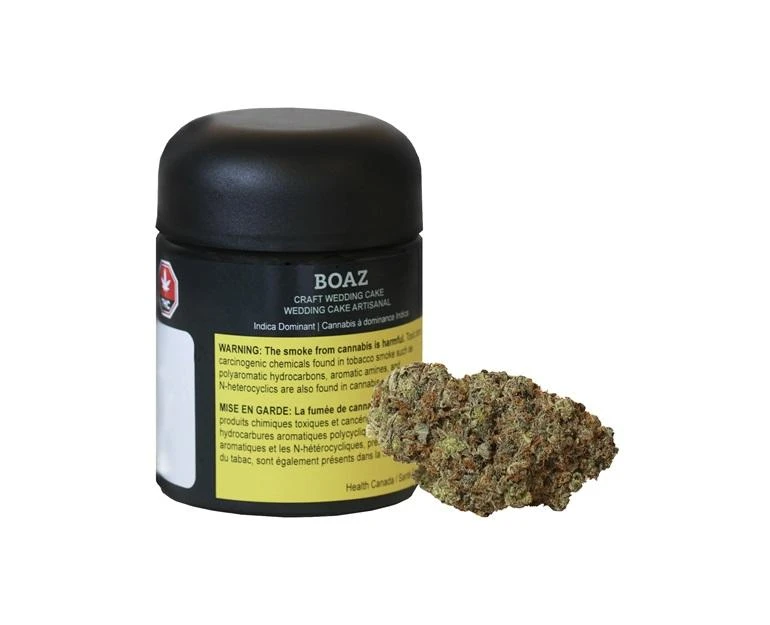 BOAZ Wedding Cake doesn’t exactly taste like any traditional nuptial dessert most have ever tasted – instead, its profile is mostly sour and tangy with just a hint of creaminess. Increasingly popular, Wedding Cake has chunky, globular nuggets that adhere in a dense, indica-typical bud structure. It has a strong vegetal smell, damp and mossy with just a hint of citrus. Hanging out underneath is a skunky funk that betrays the influence of its parental lineage Cherry Pie, crossed with Girl Scout Cookies. Our product was grown as a small batch in a high-tech indoor facility in central Alberta. Every bud is carefully hang dried, hand trimmed and cold cured to our exact standards.