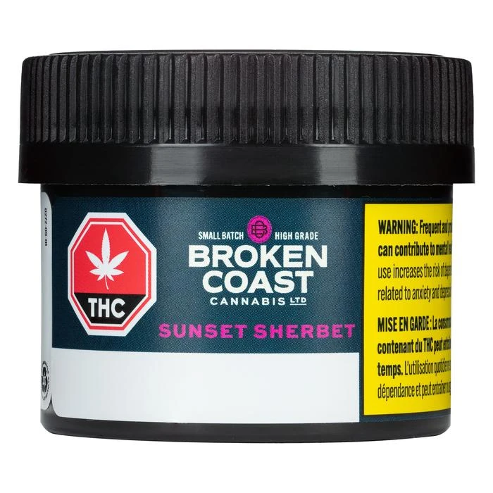 High-THC Sunset Sherbet exhibits dense indica-dominant flowers with deep purple and silver colouration and the large swollen calyxes are covered so thickly in glandular trichomes they’re almost white. With the most abundant terpenes being caryophyllene, myrcene, and limonene, Sunset Sherbet may be Broken Coast’s most fruit-forward strain yet, evoking the truly unique smell and taste of a basket of strawberries and guava.