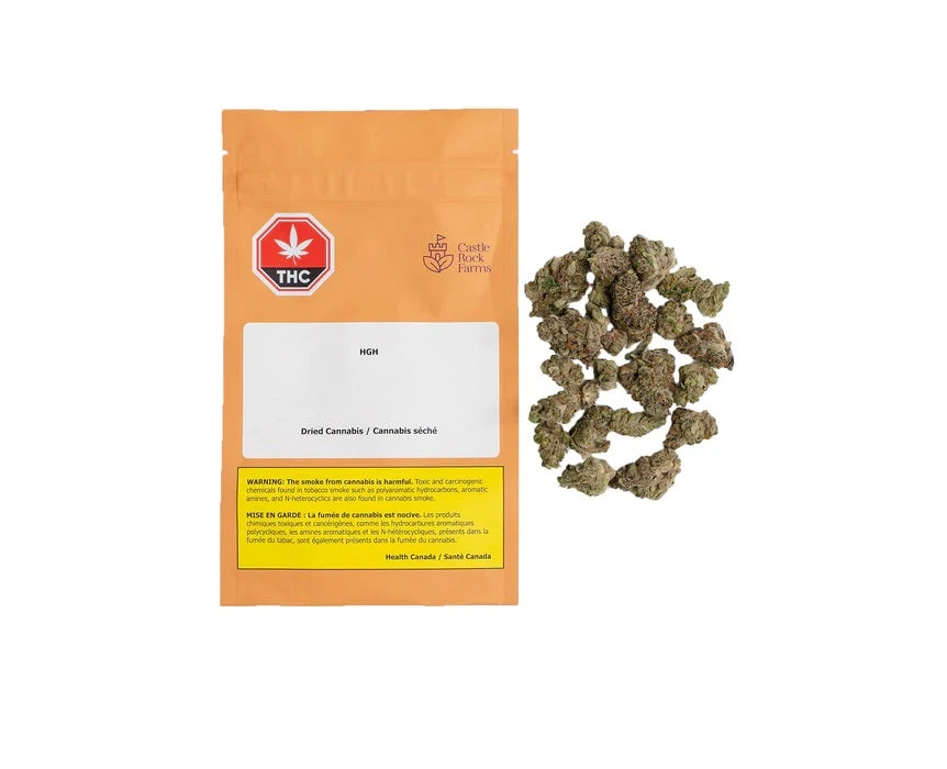 Indica-dominant HGH was bred by combining GMO with Bruce Banner. These buds grow large, dense and covered in trichomes. These beautiful buds are green/purple and carry an extremely heavy gassy nose. It has a terpene profile of beta-caryophyllene, beta-myrcene, and limonene.