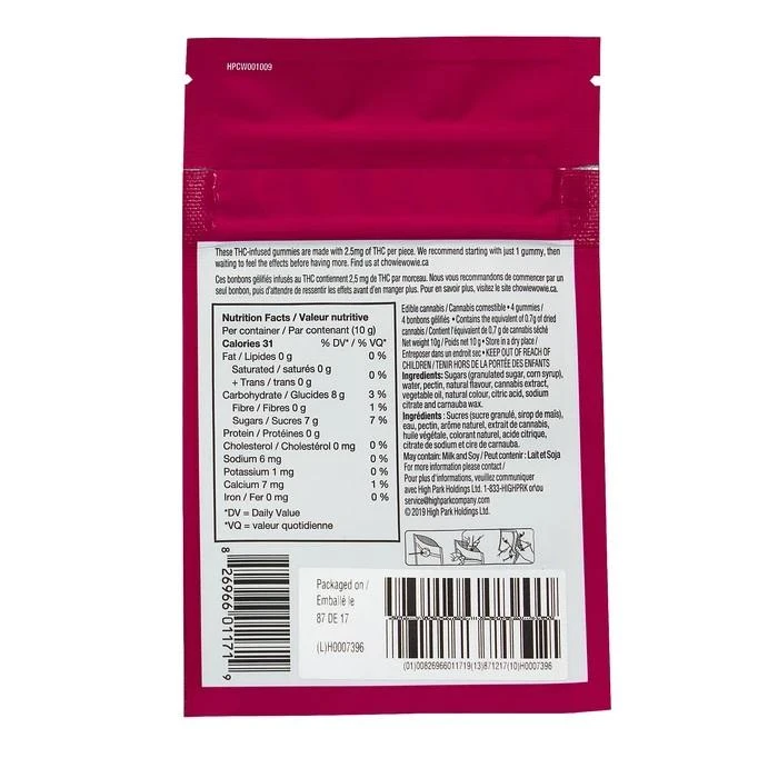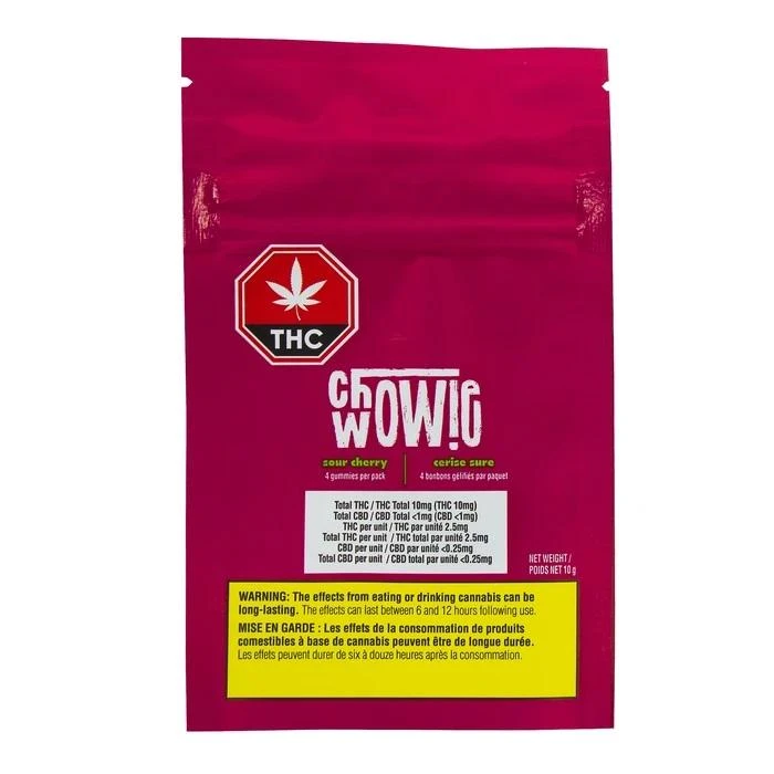 With 4 gummies per pack, each Chowie Wowie Sour Cherry Gummy contains 2.5mg of THC and trace amounts of CBD. Contains milk and soy.