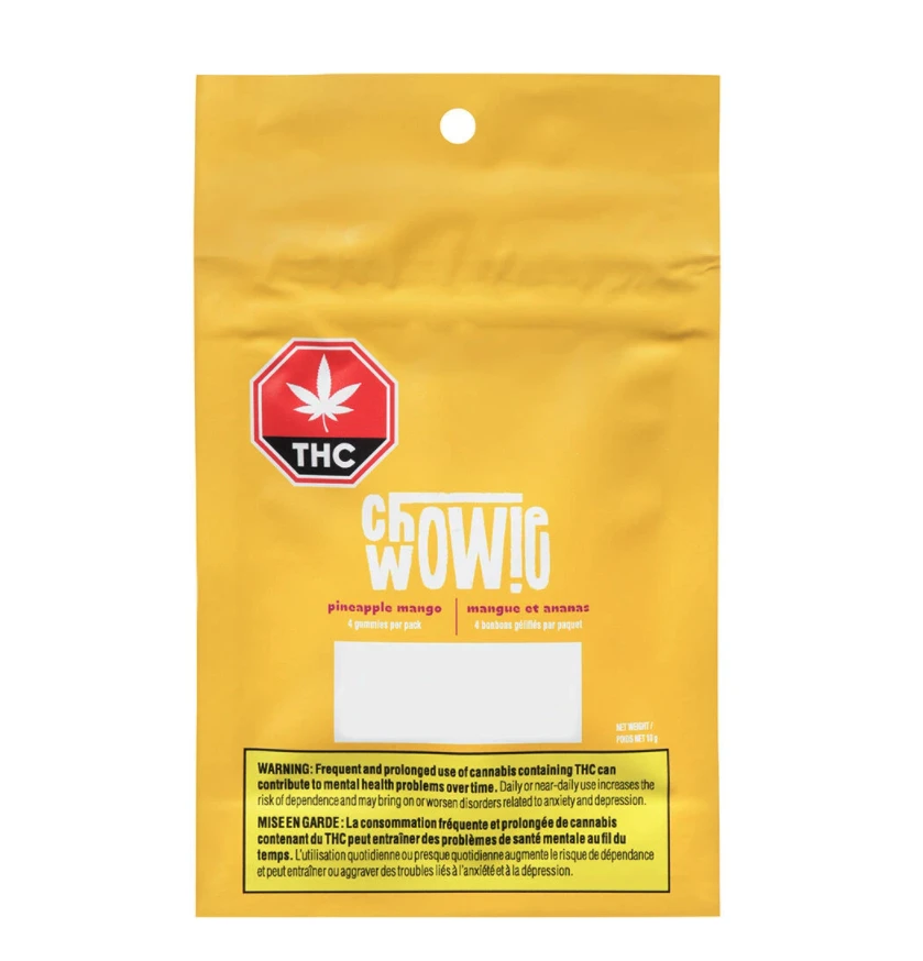 A pineapple mango tango in your mouth. 4 soft chews per pack, each Chowie Wowie Pineapple Mango Soft Chew contains 2.5 mg of THC and 2.5 mg of CBD, perfect for dosing and sharing. Start with 1 soft chew then wait to feel the effects.