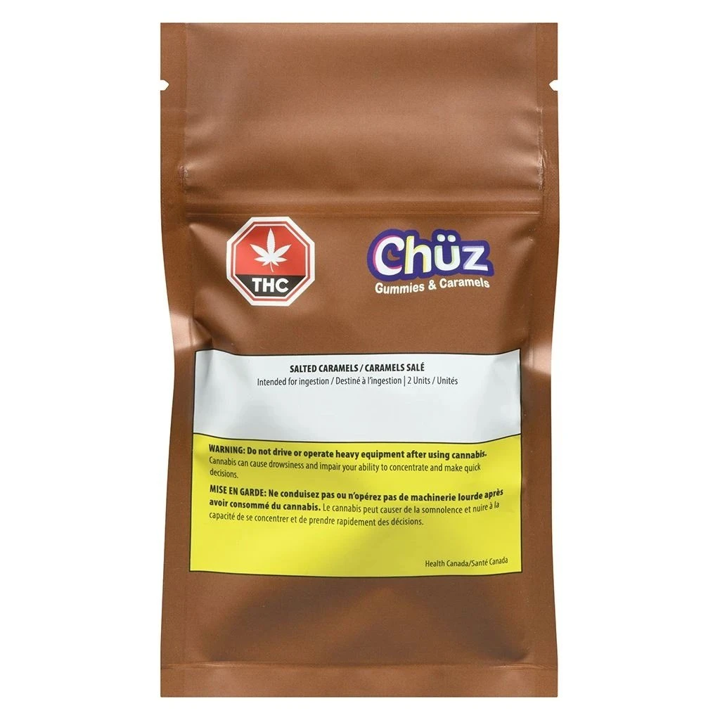 Chüz salted soft caramel double packs are handcrafted by our dessert and confectionery chef in the Canadian Rockies. This two-pack of caramels includes two caramels with 5 mg of THC in each caramel. These delicious treats combine rich and creamy caramel with a salted dusting that will tantalize the taste buds. Chüz uses MCT oil in the creation of all our edibles.