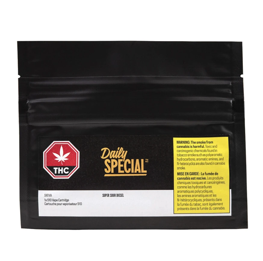 Daily Special Super Soul Diesel vapes are a high-value cannabis product, delivering high- THC for low prices. This sativa strain features a notably skunky and earthy flavour profile derived from great quality cannabis. A large cartridge size (0.5g) allows for a longer-lasting vaping experience. All Super Sour Diesel cartridges are built to deliver a consistent and superior experience, featuring stainless steel construction and ceramic atomizer to prevent leeching.