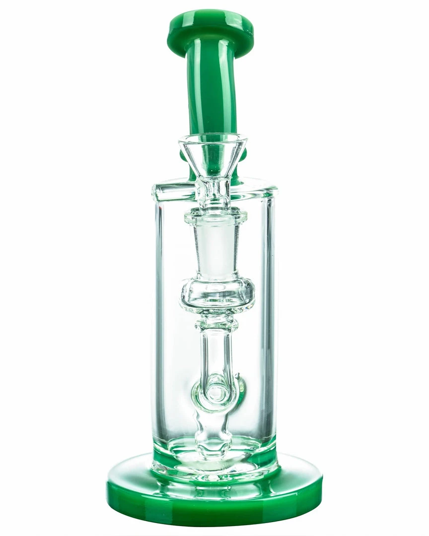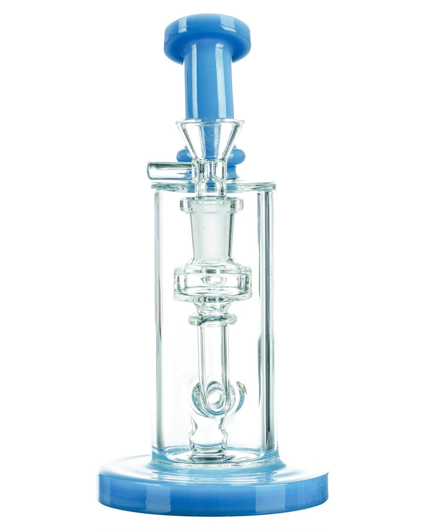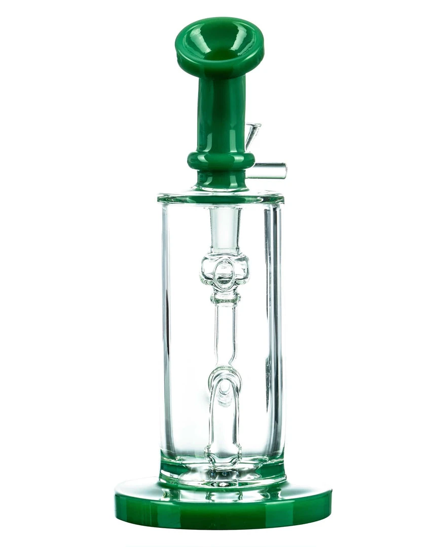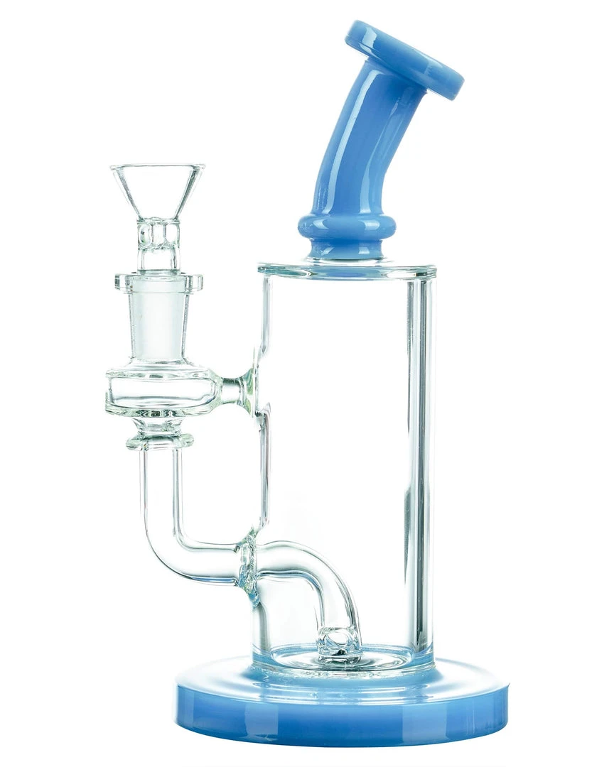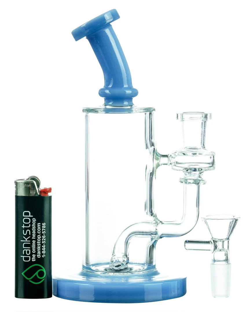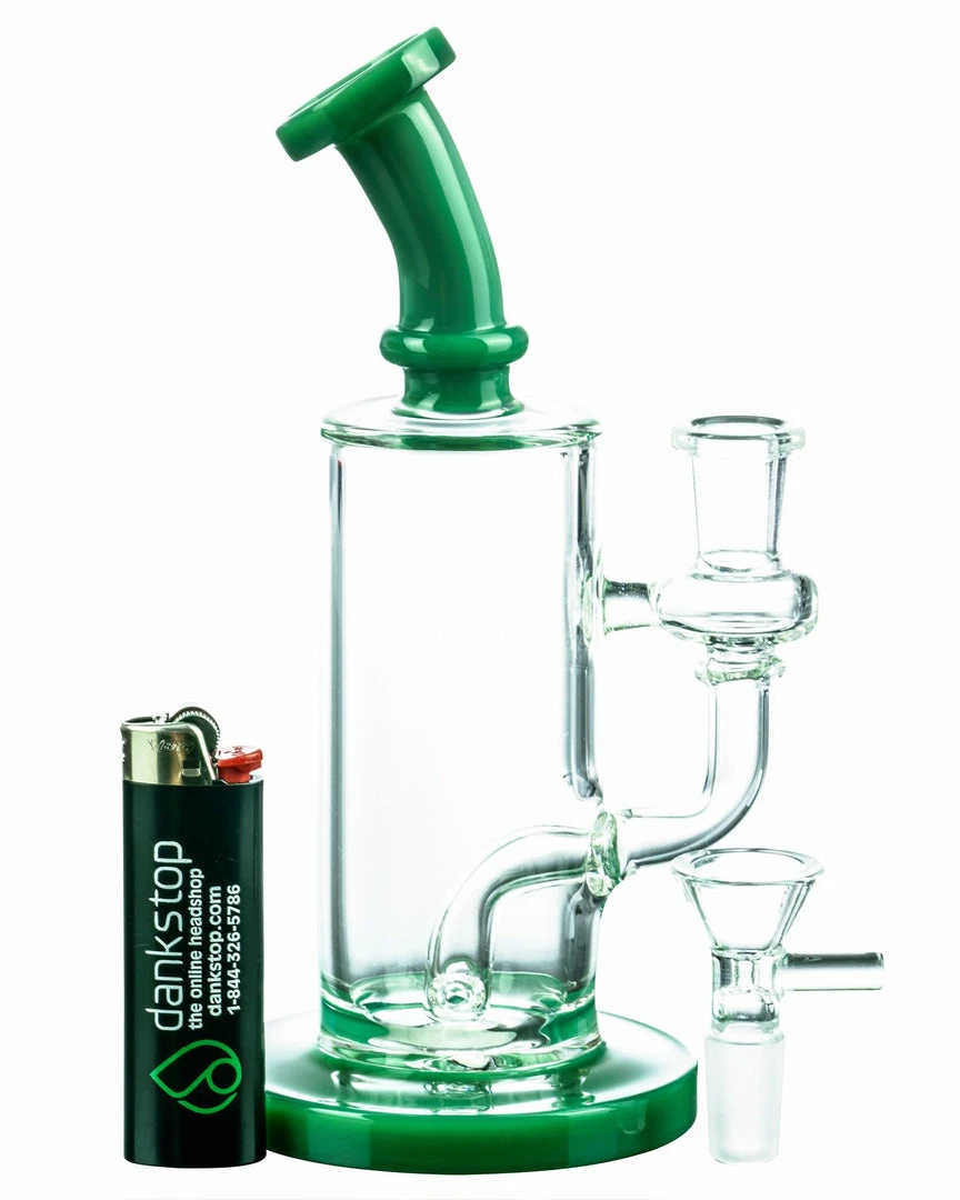 The Bent-Neck Tall Can Bongs crystal clear chamber looks as if the color accented base and mouthpiece are connected by nothing but air, but that will certainly change when you fill the tall chamber with bountiful clouds of smoke! A thick colored glass base acts at the pedestal for this perfect piece, supporting a multi-hole fixed downstem perc, can style water chamber with 14mm dewars enforced female joint, and matching colorful bent neck mouthpiece. Pack your dry herbs into the included funnel-style male bowl and welcome home your new daily driver!