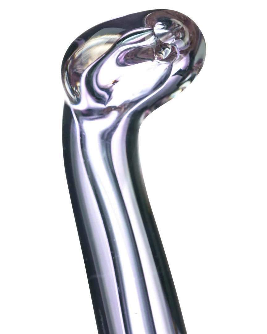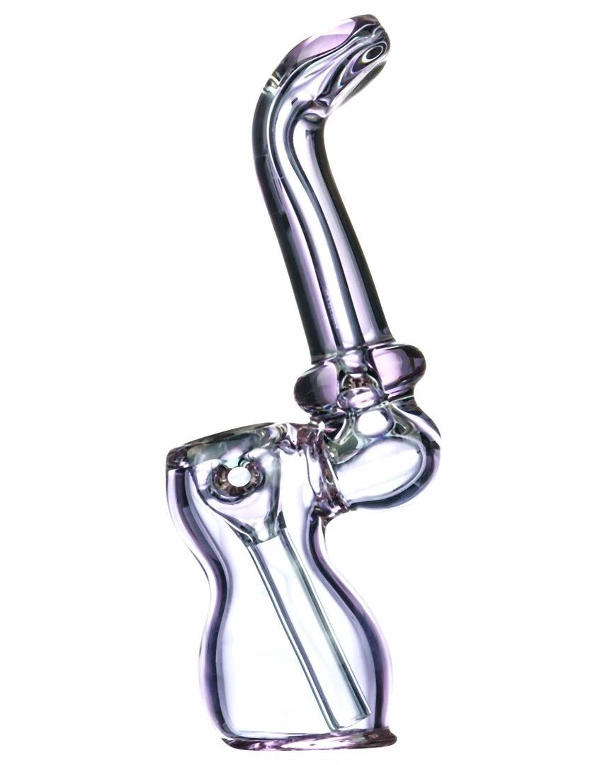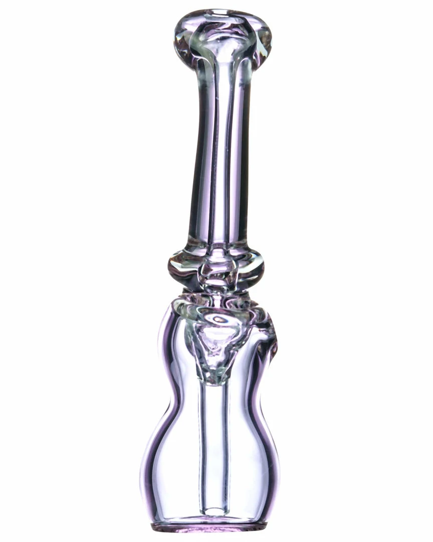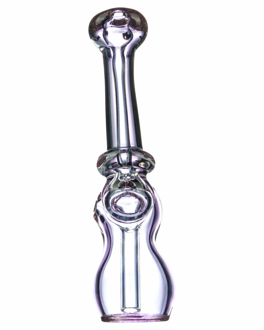 No frills on this Sherlock Bubbler, just sleek quality. Made from thick, clear glass with a lovely purple tint this Sherlock bubbler makes for an excellent daily driver. Hard to beat the smooth hit of a bubbler, just a little bit of water goes a long way with the help of a fixed downstem perc. A Maria ring on the curved neck allows for easier grip when holding this piece in hand, and a flat mouthpiece creates additional comfort when in use.Β Standing at around 6″ this handmade Sherlock Bubbler is a useful little addition to any smokers collection.