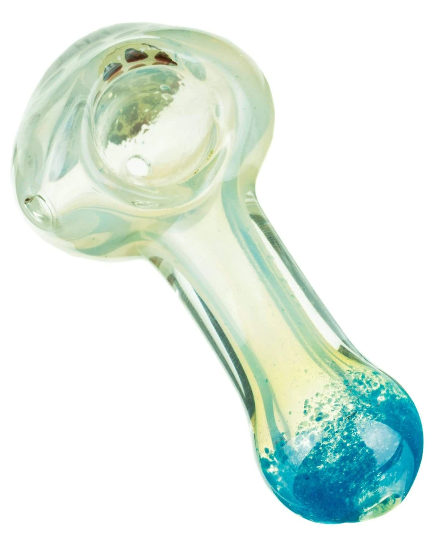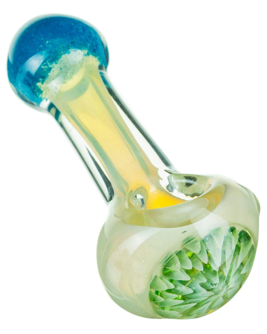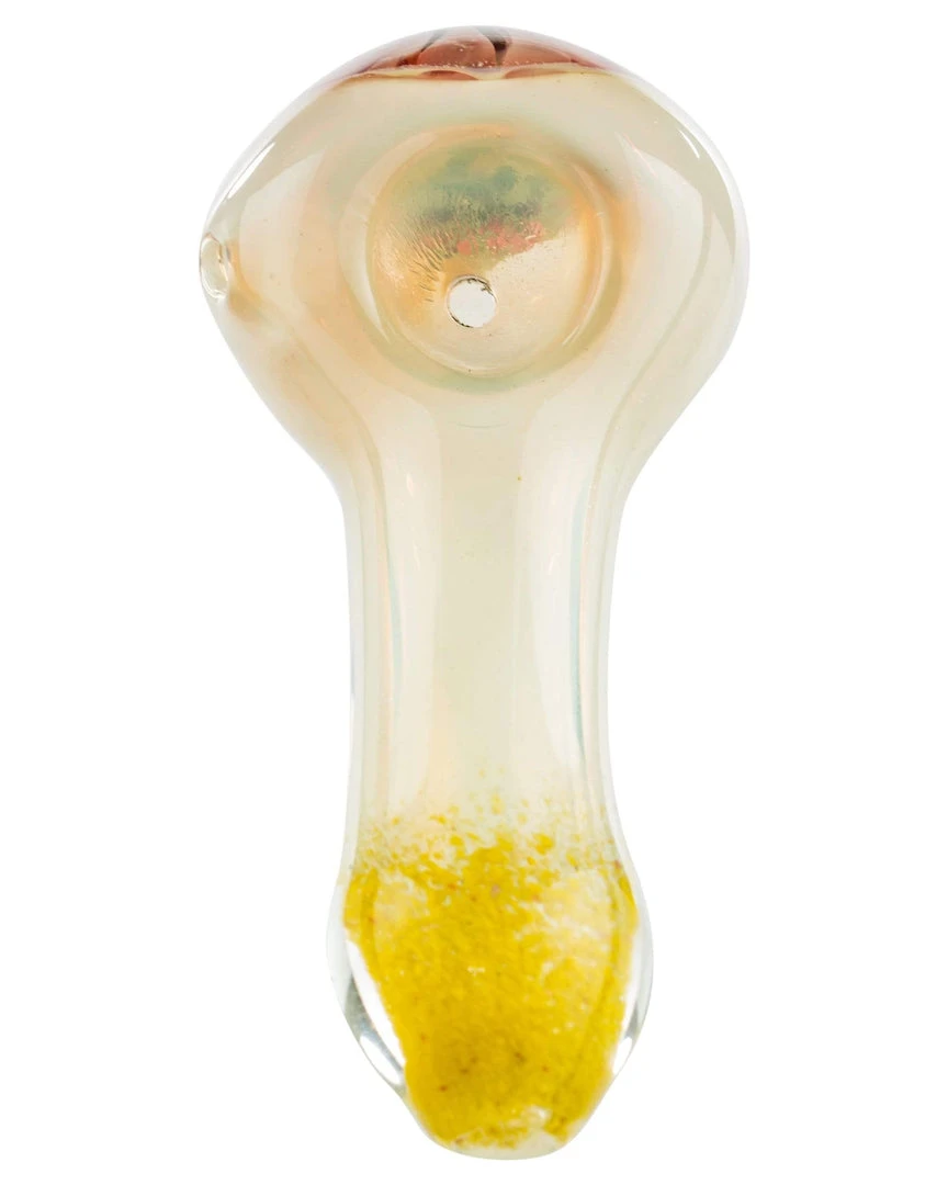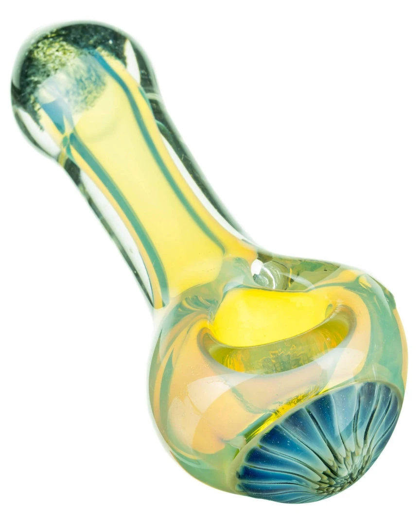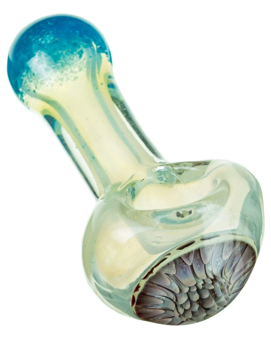 There are not many hand pipes that come in your choice of mouthpiece color. The Fumed Mushroom Milli Spoon Pipe has different color mouthpieces to choose from including black, blue, and orange. The color you choose comes in a fritted style and ends at the opening of the mouthpiece. Every one of these hand pipes have fumed glass tubing throughout. The more you smoke a glass pipe with fumed coloring, the more the color changes. This is great because when most other pipes just look dirty, the Fumed Mushroom Milli Spoon Pipe looks unique. The fumed glass tubing goes from one end of the spoon pipe to the other, encompassing the deep bowl. For a smaller pipe, this bowl has plenty of room for huge packs. No more having to repack every time someone takes a hit.There is a side carb hole located to the left of the deep bowl. This hole controls the airflow while you are inhaling. Also considering its size, the Fumed Mushroom Milli Spoon Pipe is made with thick glass. The main attraction, besides being able to pick the color of your mouthpiece, is the mushroom milli located on the front of the hand pipe. Although the color of the mushroom milli varies, its beauty certainly does not. The way the pipe is blown, the glass milli has an almost 3-D effect when looking at it head on. With such an amazing, artisitic feature, the Fumed Mushroom Milli Spoon Pipe is perfect for simple smoking while still impressing your friends.