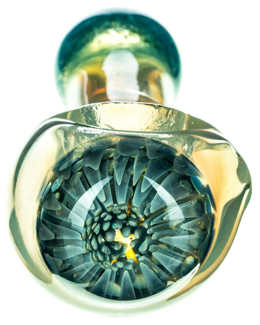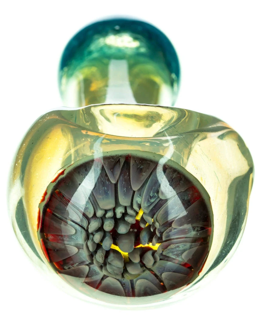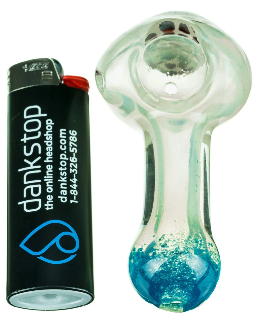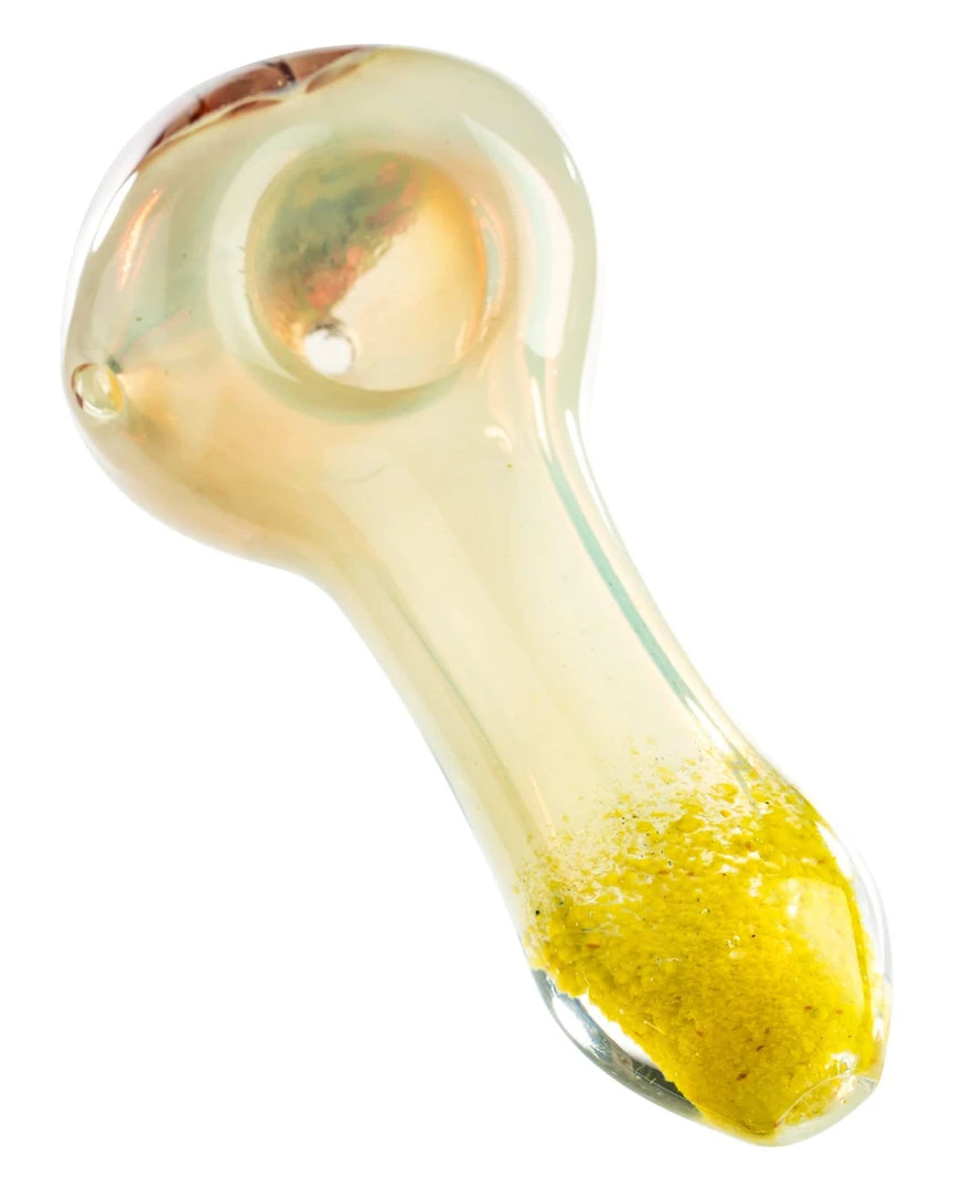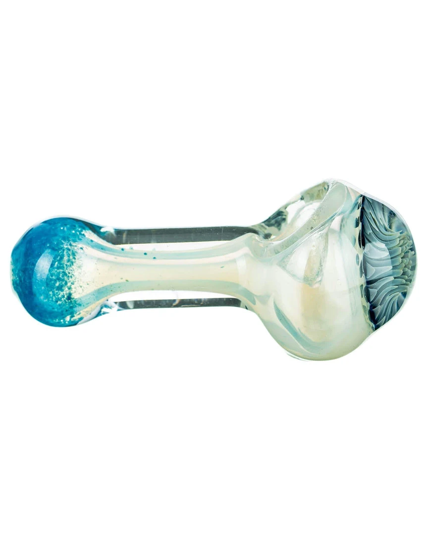There are not many hand pipes that come in your choice of mouthpiece color. The Fumed Mushroom Milli Spoon Pipe has different color mouthpieces to choose from including black, blue, and orange. The color you choose comes in a fritted style and ends at the opening of the mouthpiece. Every one of these hand pipes have fumed glass tubing throughout. The more you smoke a glass pipe with fumed coloring, the more the color changes. This is great because when most other pipes just look dirty, the Fumed Mushroom Milli Spoon Pipe looks unique. The fumed glass tubing goes from one end of the spoon pipe to the other, encompassing the deep bowl. For a smaller pipe, this bowl has plenty of room for huge packs. No more having to repack every time someone takes a hit.There is a side carb hole located to the left of the deep bowl. This hole controls the airflow while you are inhaling. Also considering its size, the Fumed Mushroom Milli Spoon Pipe is made with thick glass. The main attraction, besides being able to pick the color of your mouthpiece, is the mushroom milli located on the front of the hand pipe. Although the color of the mushroom milli varies, its beauty certainly does not. The way the pipe is blown, the glass milli has an almost 3-D effect when looking at it head on. With such an amazing, artisitic feature, the Fumed Mushroom Milli Spoon Pipe is perfect for simple smoking while still impressing your friends.