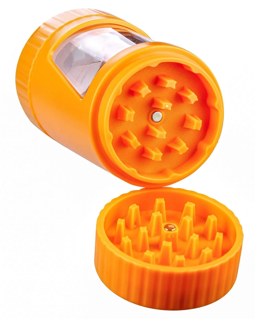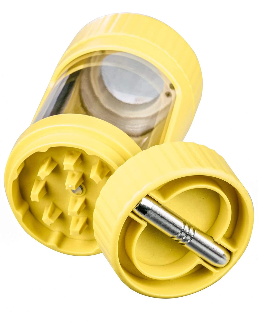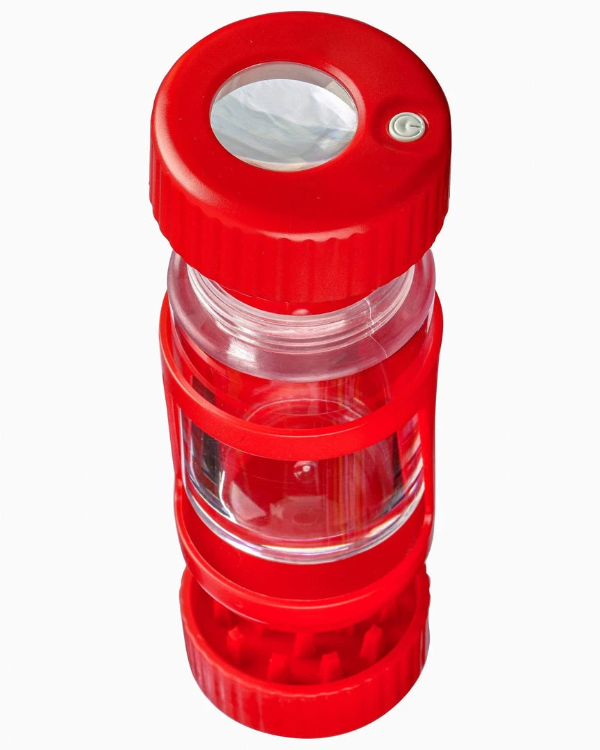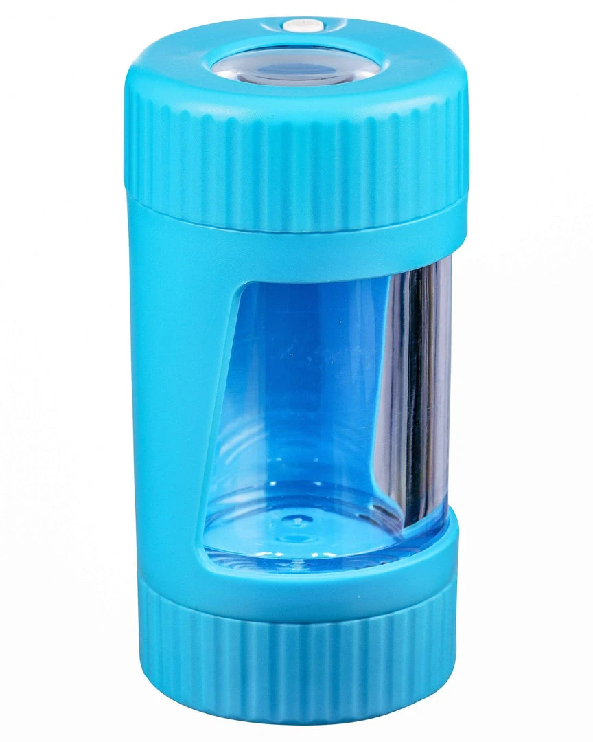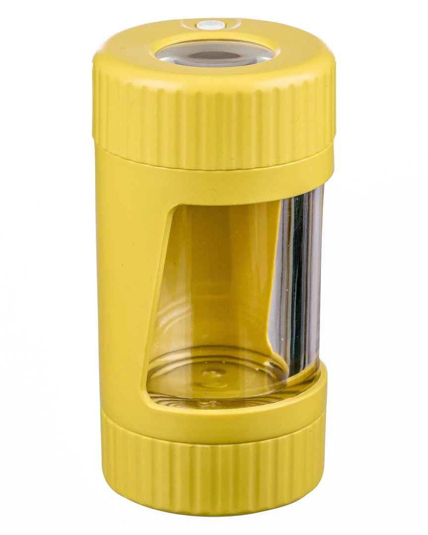 The LED Viewing Chamber Grinder & Stash Jar is food-grade material, including the removable stash jar. Itβs handy for on-the-go herb grinding with a hidden pipe for emergency use!