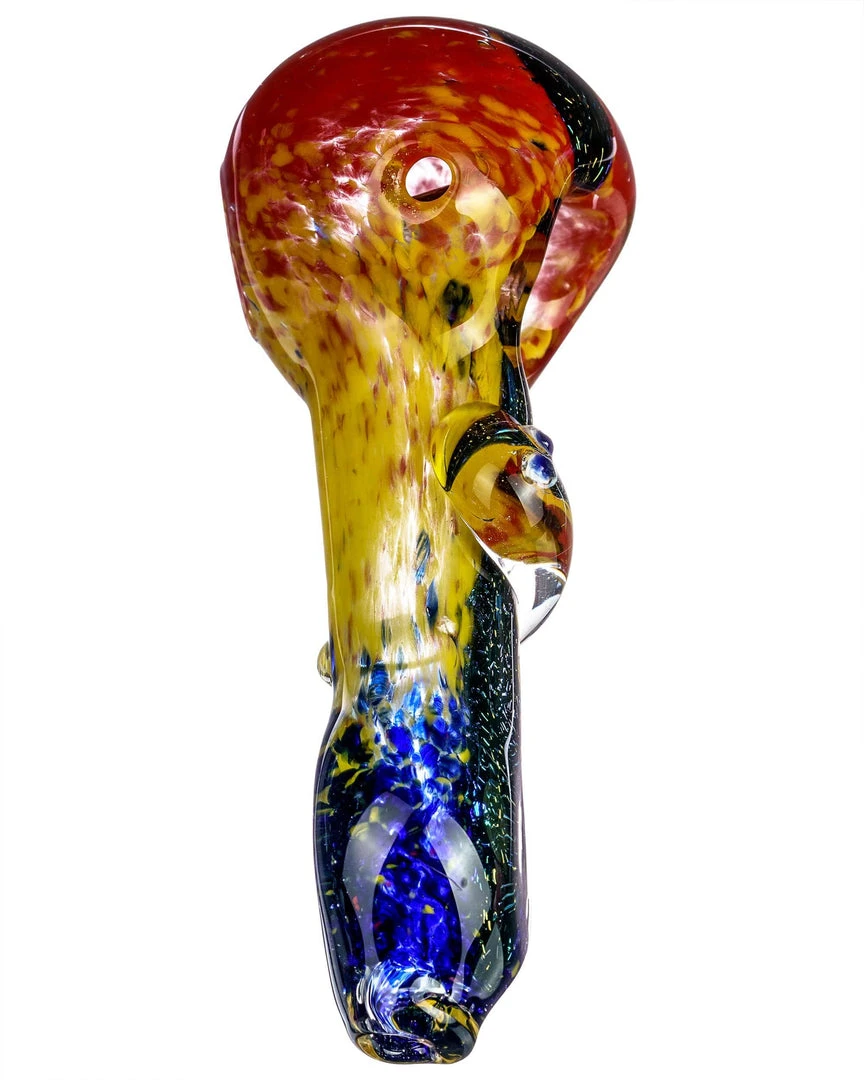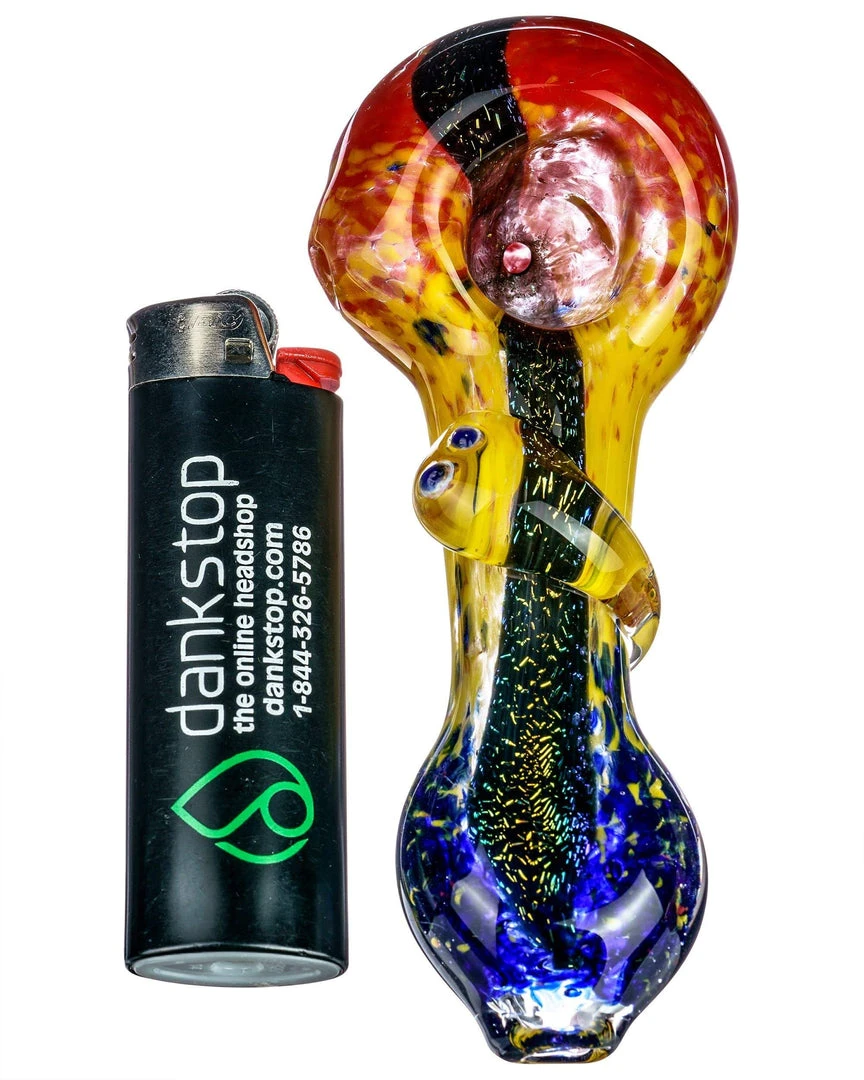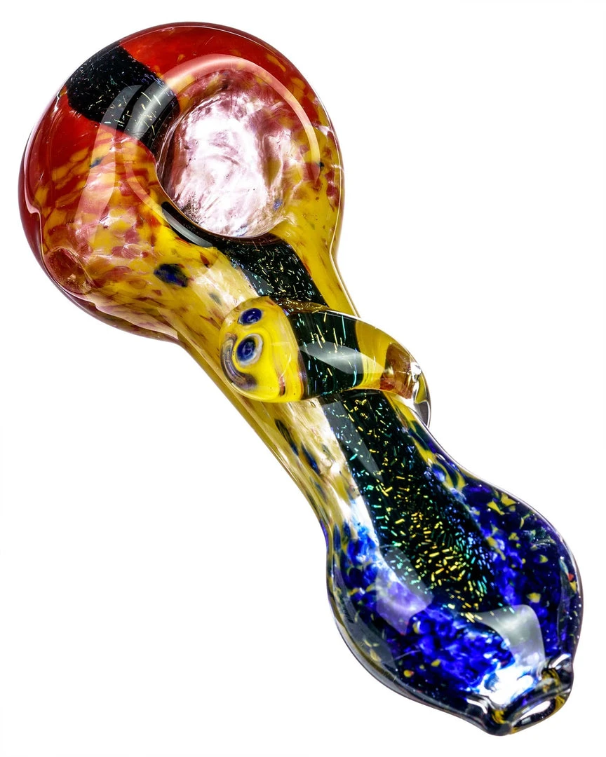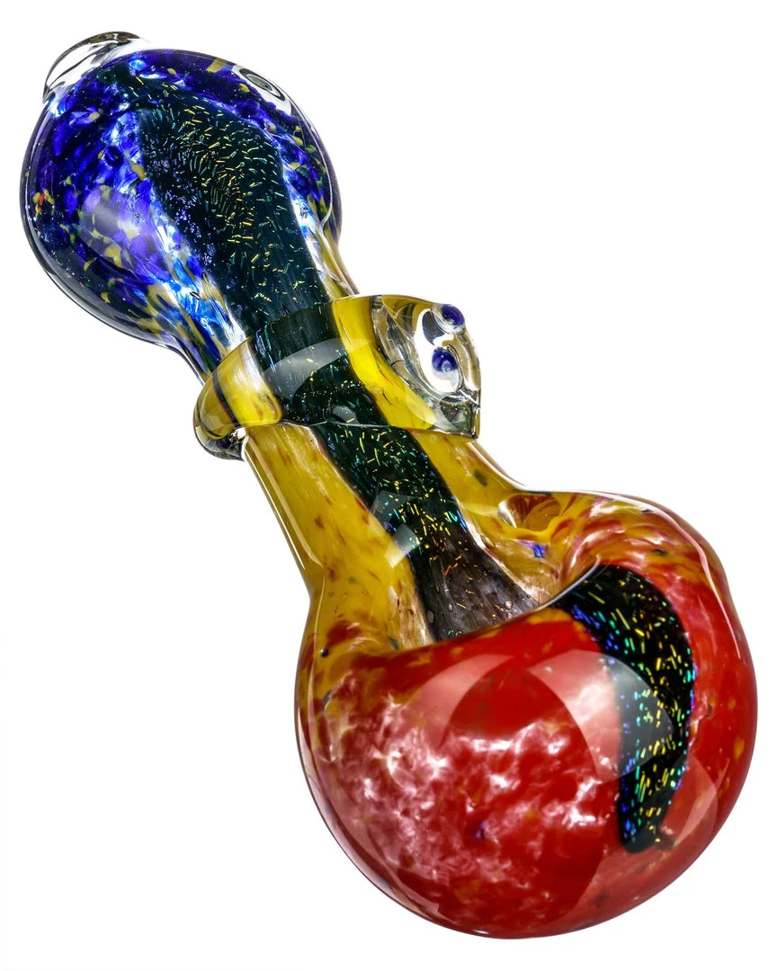 Between the fritted color scheme and dichro stripe, this spoon would be cool enough but look closer and you’ll see it also has a little friend! The Dichro Stripe Fritted Hand Pipe hasΒ a little creature hidden on it, and is made with thick glass with a deep bowl. A flat base located under the bowl keeps your pipe from falling over and spilling any of that precious herb. Due to the fritted style, not all color schemes will be the same.