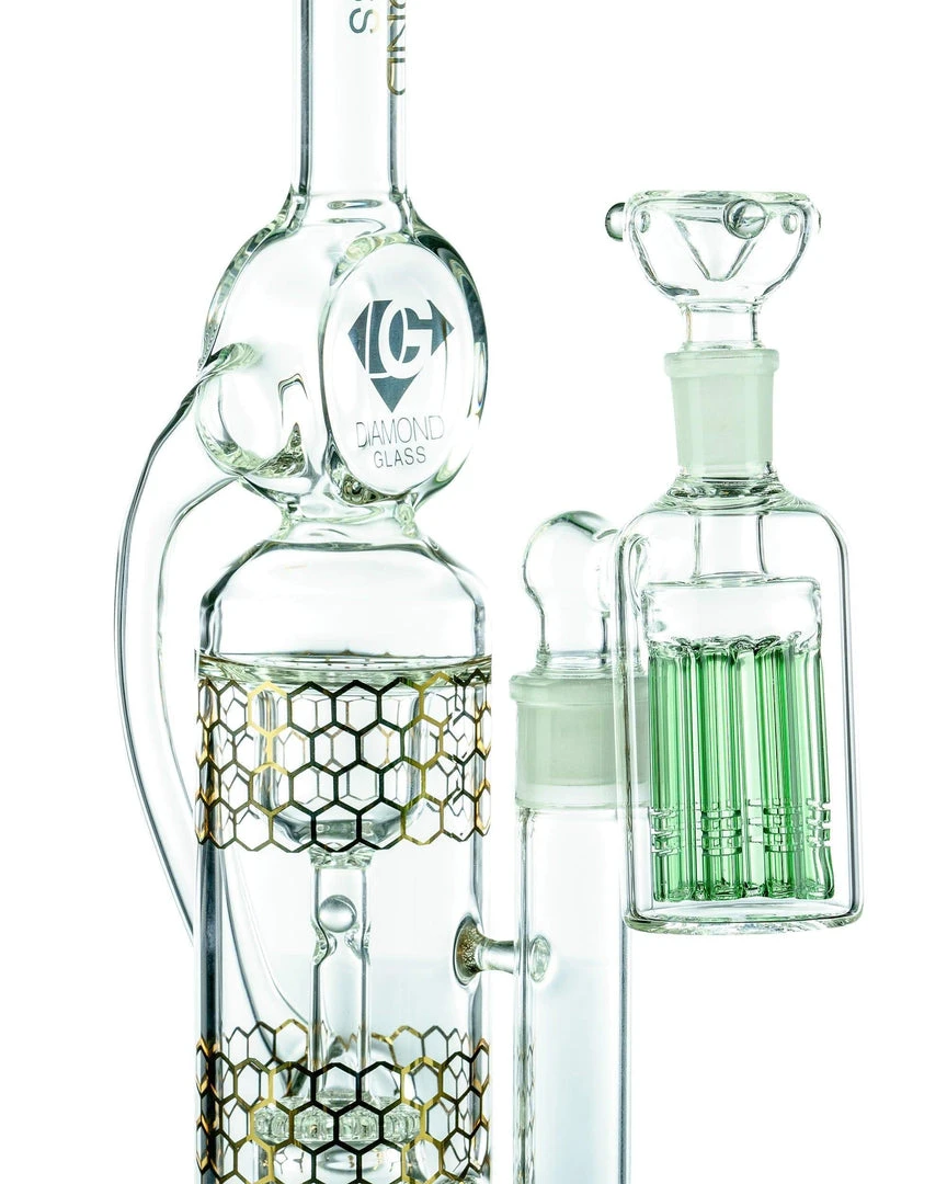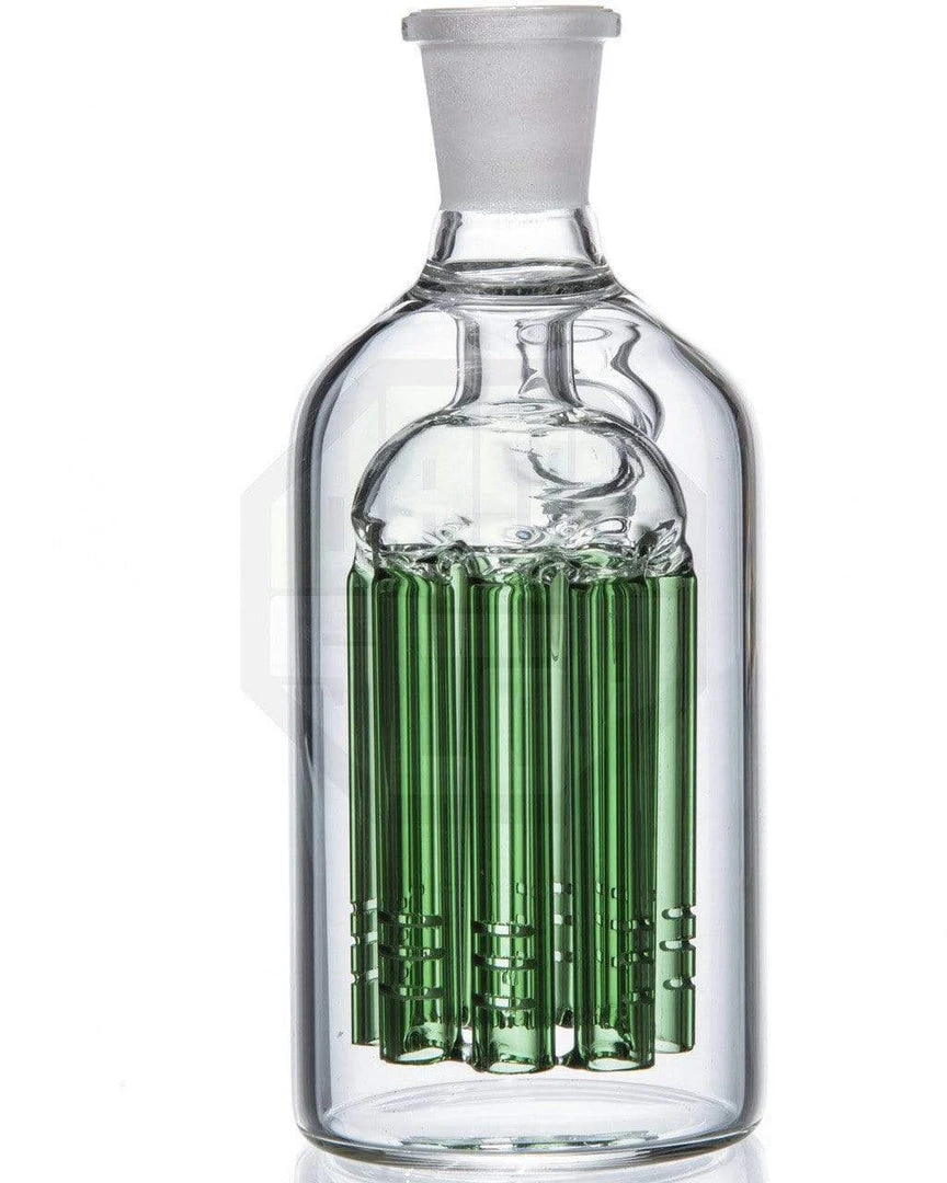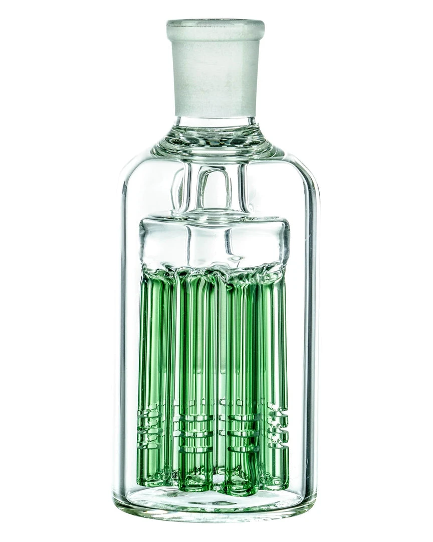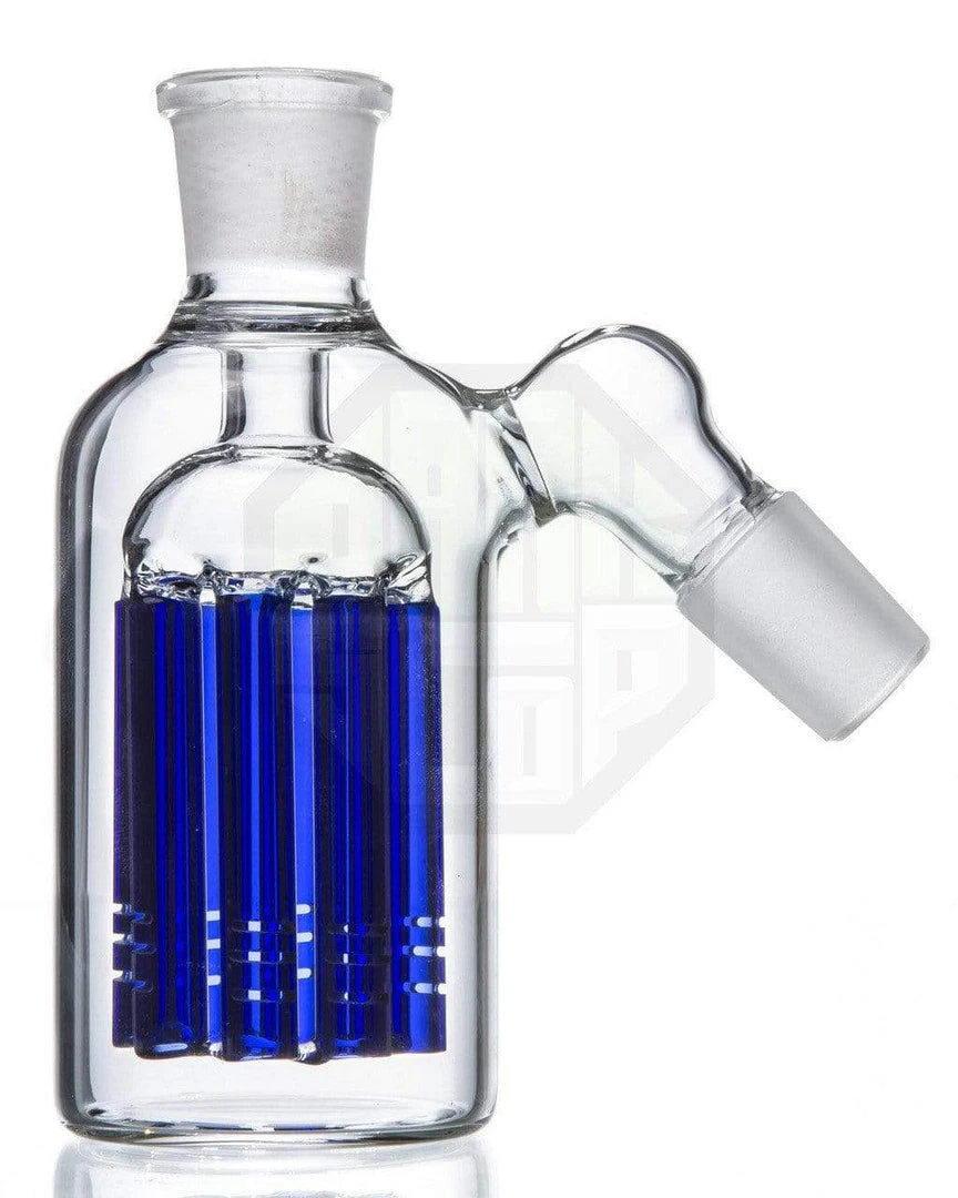 This scientific glass ashcatcher features an 8 arm tree percolator. Enjoy more smooth smoke and a cleaner water pipe by using a percolated ash catcher. It is available in your choice of 14mm or 18mm joints, as well as green, blue, and clear colored glass.