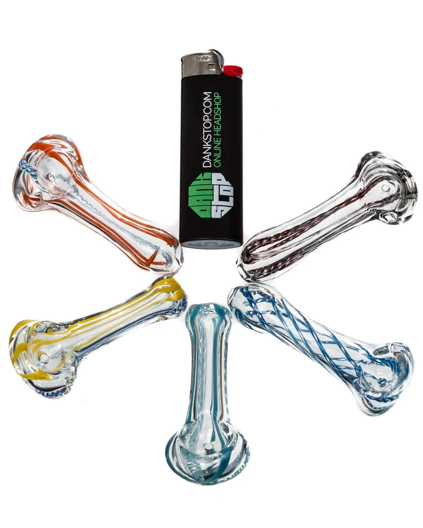 These glass pipes are perfect travel pipes measuring only 2.5″ long. This mini pipe has fantastic portability for discreet and on the go smoking. This glass pipe comes with colored glass accents. Colors are chosen at random.