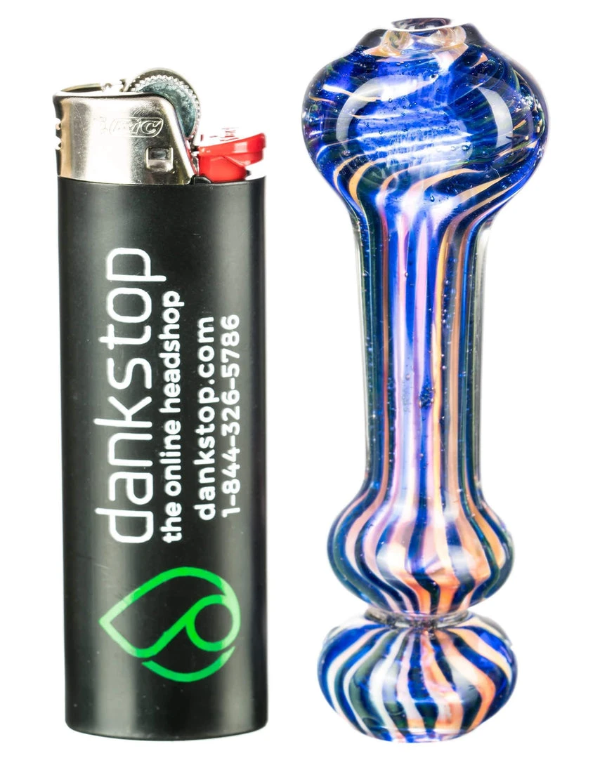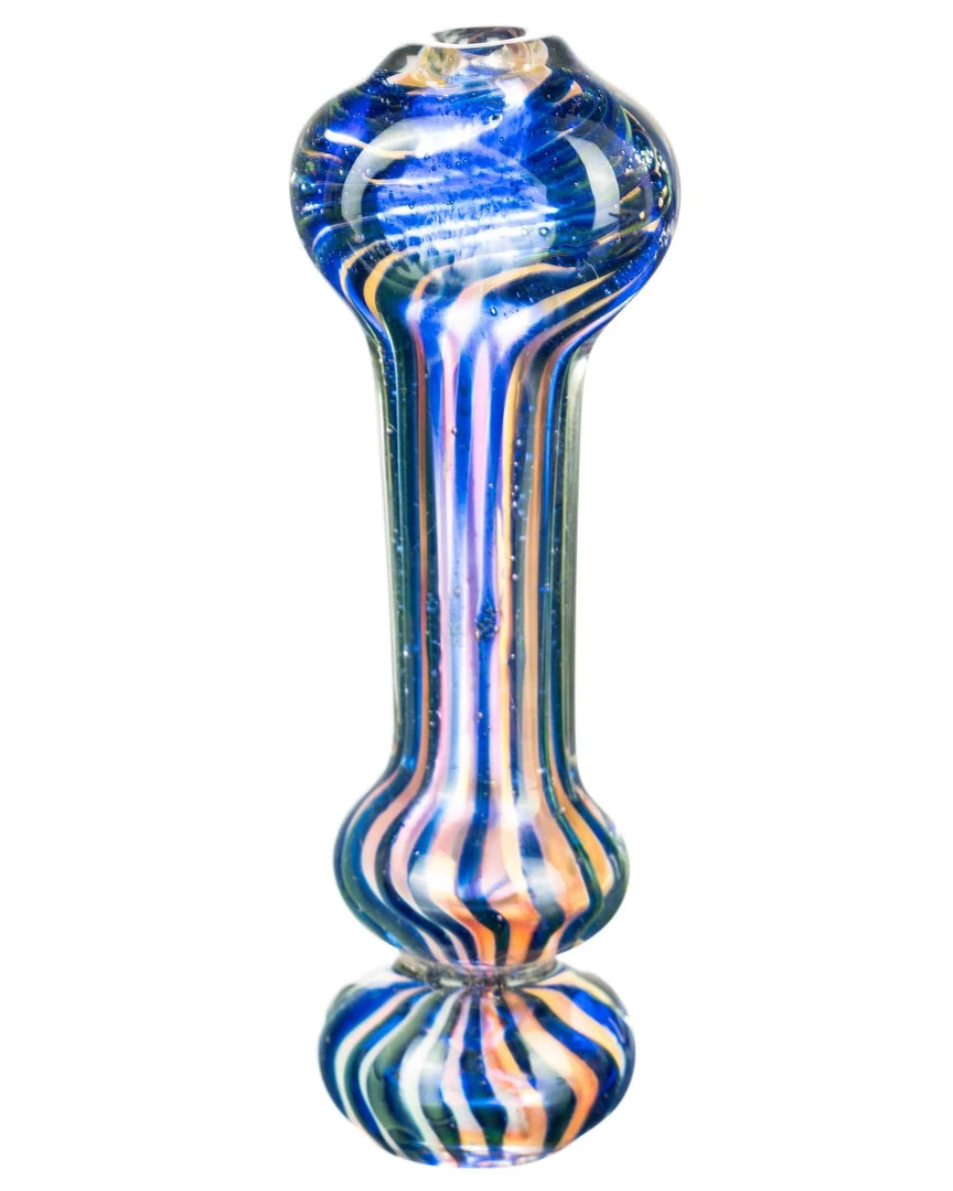 Follow the mesmerizing lines on the Tron Trail Chillum. Multiple blue lines, reminiscent of the color scheme in the Tron franchise, run parallel to one another. Each line stretches from the mouthpiece, through the body, and to the tip of the bowl. The mouthpiece is flat so the hand pipe will not roll off any surface. This can prove to be very beneficial as a fallen chillum can result in loss of product, a full mess, and worst case scenario, a broken pipe. The flat mouthpiece also feels better on your lips while inhaling. The body of the Tron Trail Chillum has a pink, fumed glass makeup with the blue lines running over it. The lightly fumed glass can look different when held in different lights and the more you use it. Now you do not have to worry about your pipe appearing dirty, as it can actually aid in the overall look of the chillum. Right before the bowl of the Tron Trail Chillum, the pipe bellow out, pinches, then protrudes out again. The pinch is what forms the hole in the bowl. Because of the way the bowl bellows outward, there is a lip. This works as a safety net for your packed bowl, keeping your dry herbs from falling out easily.