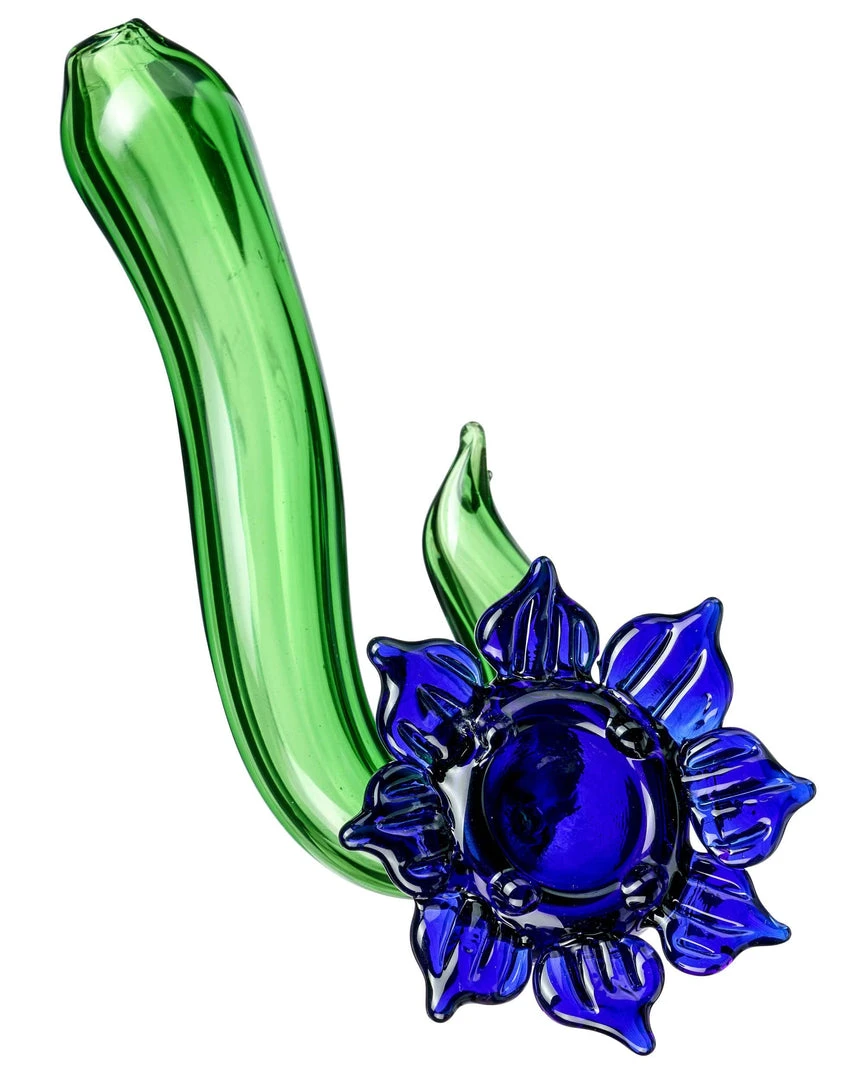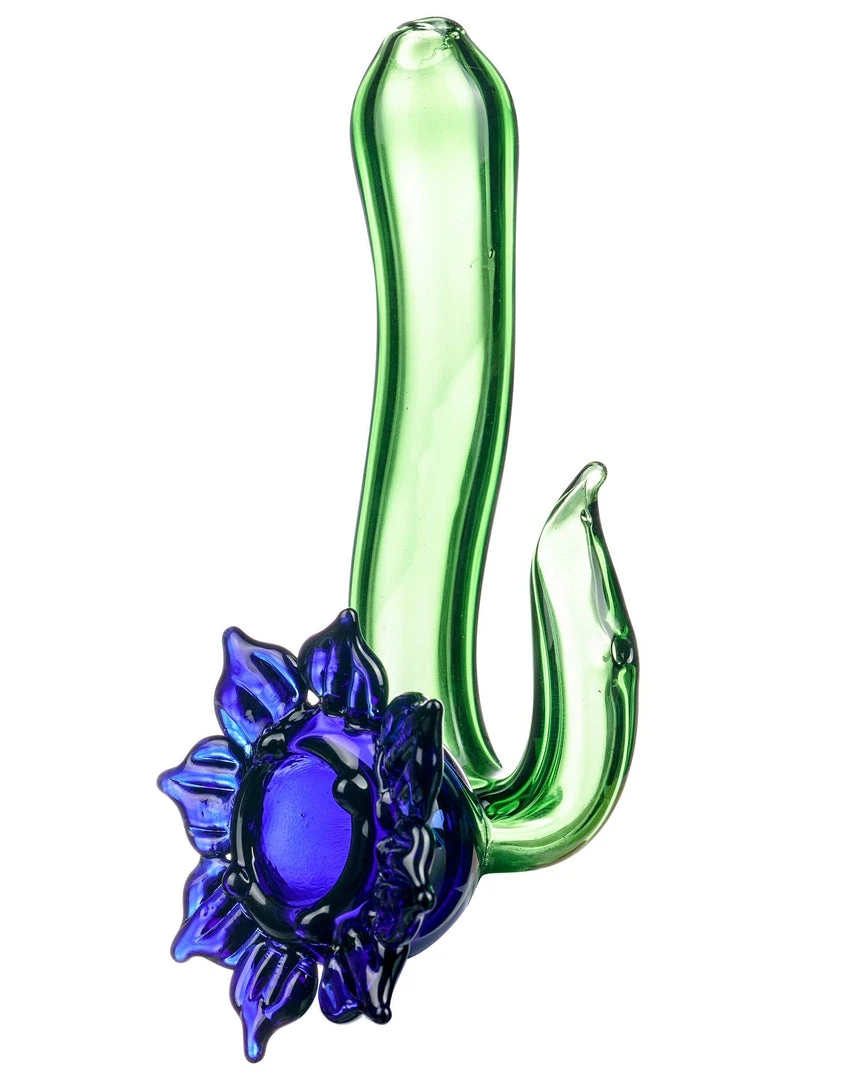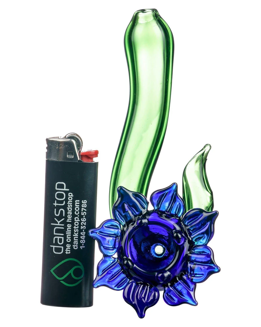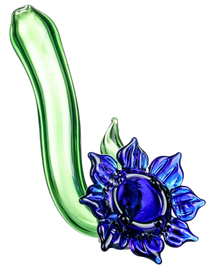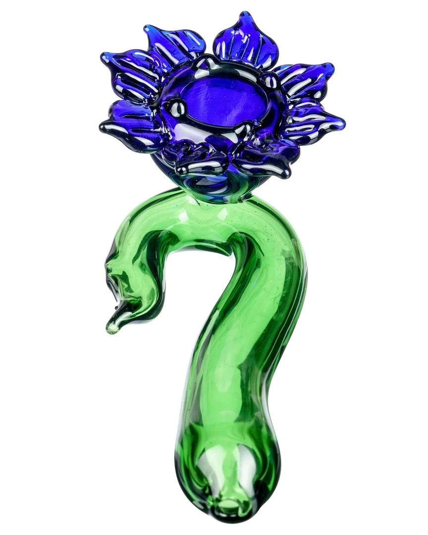 Pulling inspiration from the inherent beauty of nature, The Violet spoon pipe is just that both in color and name. A beautiful shade of blueish purple is used to craft the flower bowl, though not as delicate as the pipes budding counterpart. in the center of the flower is a deep bowl rather than a pistol and hidden beneath the flower petals is a side carb. The flowers stem is mimicked here as the pipes smoke chamber and mouthpiece, easy to hold as the perennial it’s replicates. Rather than picking a flower for your loved ones, pick this lovely long lasting spoon pipe instead!