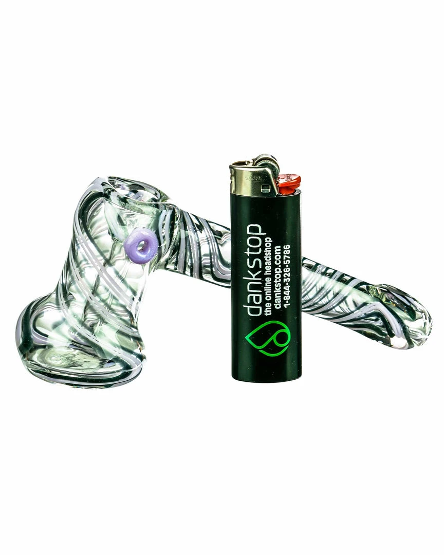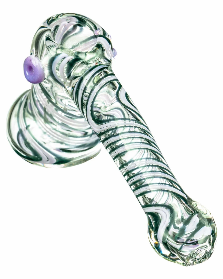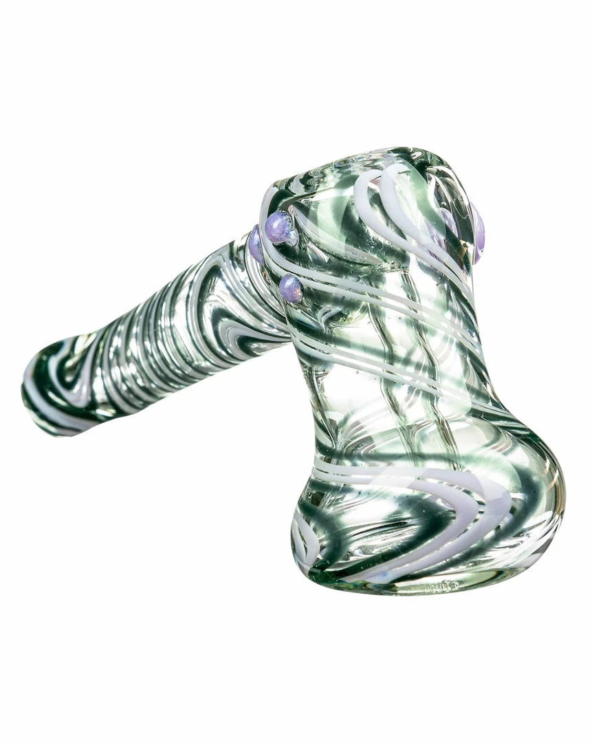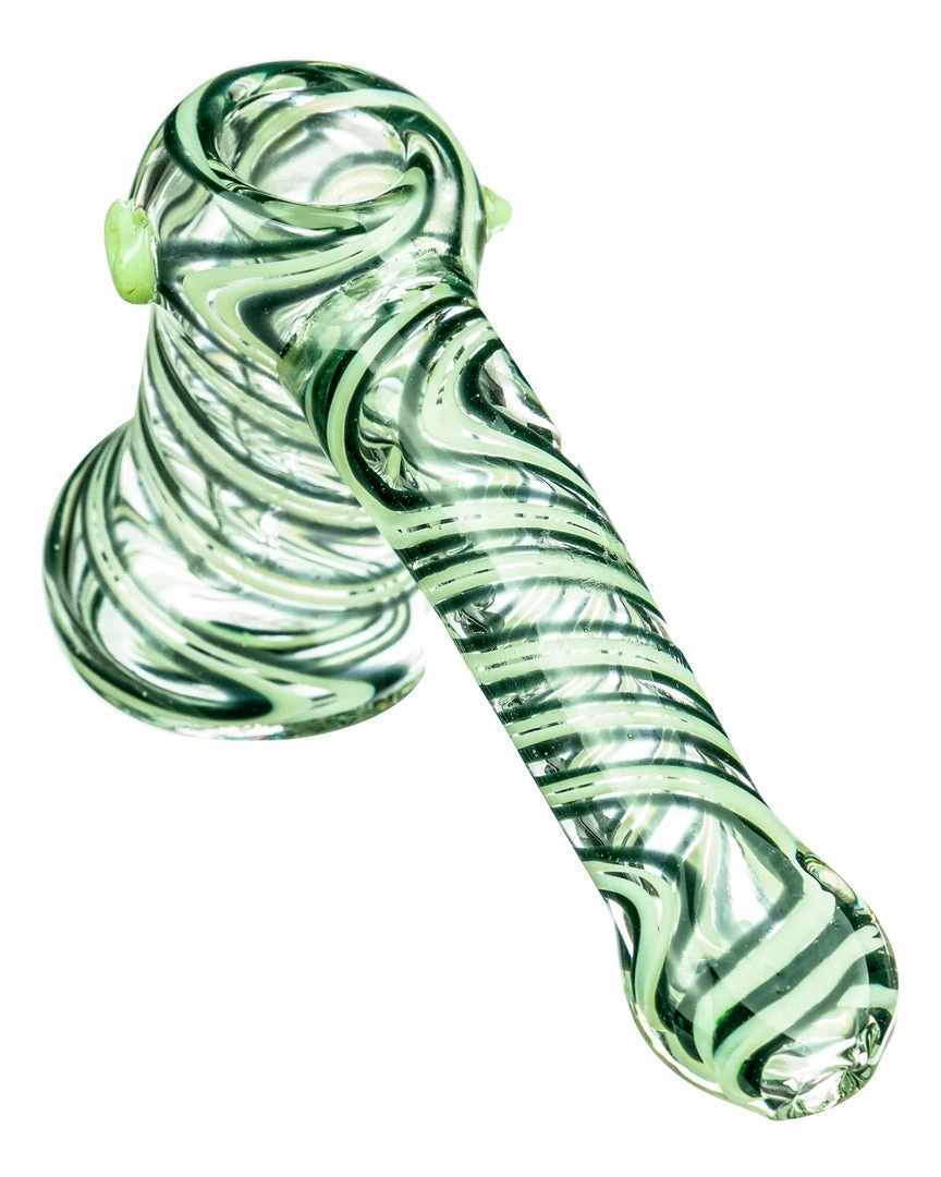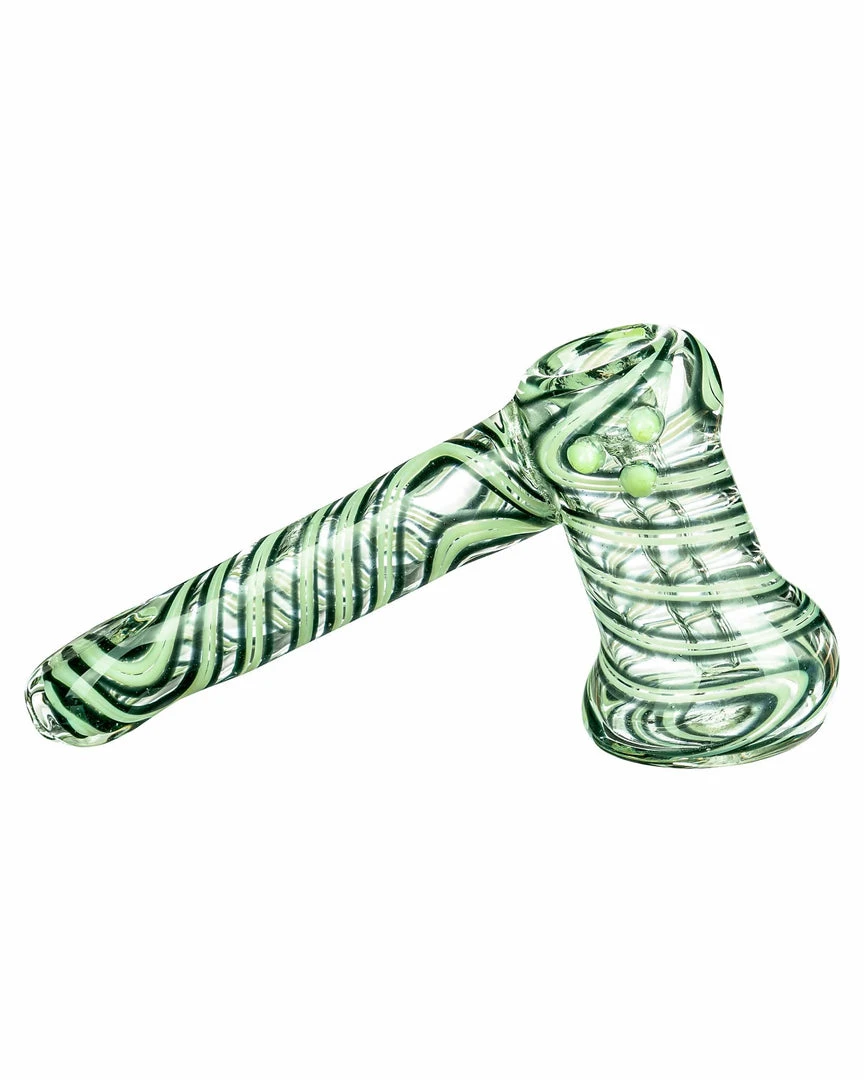 Bubblers combine the filtration of a bong with the ease of use provided by a hand pipe. The Slyme Accented Spiral and Marble Hammer Bubbler is no exception, with it’s gavel style and a fixed downstem perc. Utilizing a small amount of water this bubbler can filter your smoke for a super smooth better tasting hit than a regular dry pipe can provide. The pipes hammer style puts the mouthpiece stem high above the water chambers base acting as a natural splashguard and looks great with it’s spiral slyme accents from top to bottom and slyme marble accents opposite the left side carb.