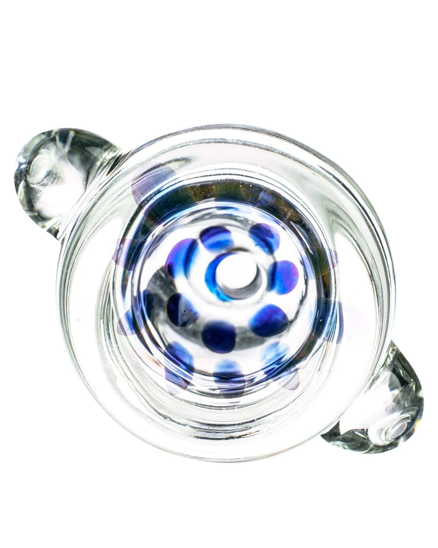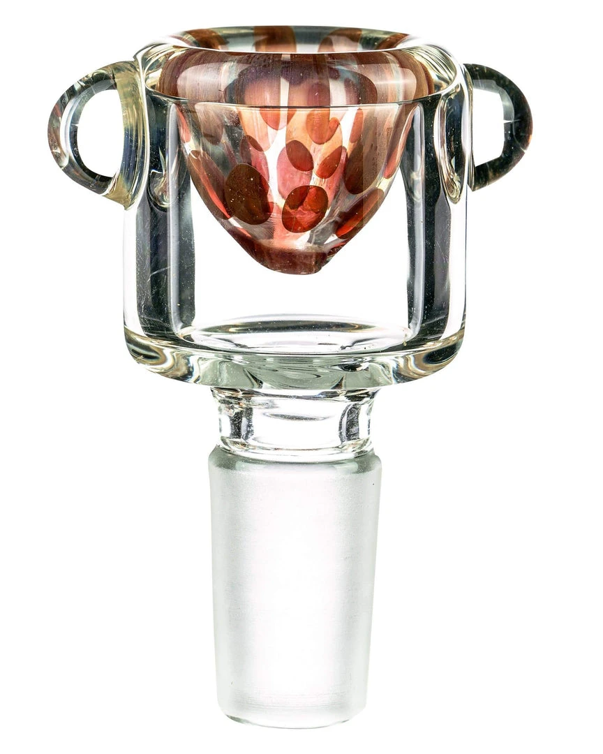 This 14mm male glass bowl has raised bead finger grips and a frosted end. Color ovals are decorating the inside of these bowls. These bong accessories have red, blue, and fumed models available.Â