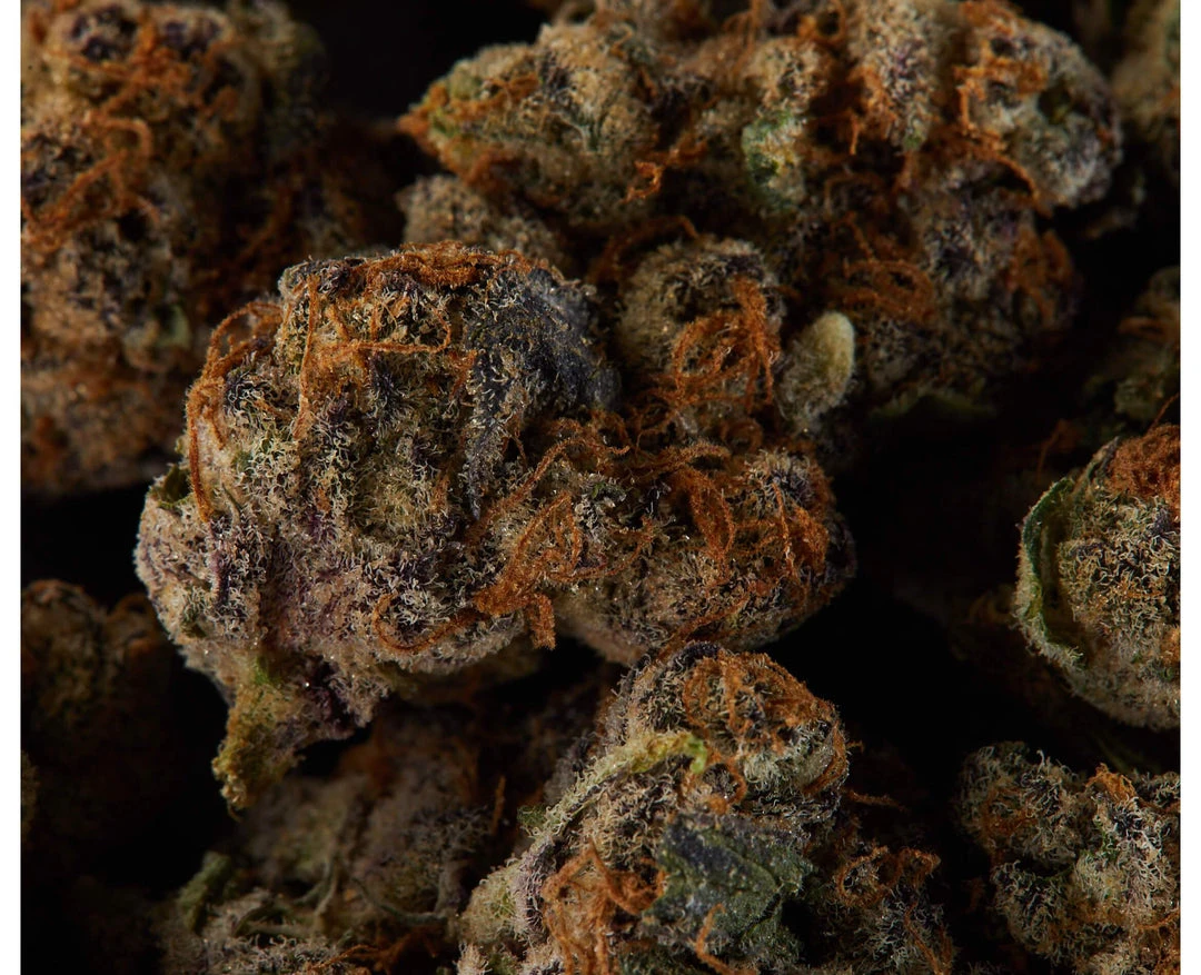 Lava Cake’s medium-sized, firm buds are covered in frosty trichomes with hues of purple and bright green, accented with light brown pistils. Before grind, the aroma is sweet and savory from the presence of caryophyllene. After grind, the aroma is relatively unchanged.