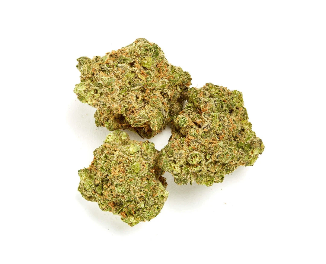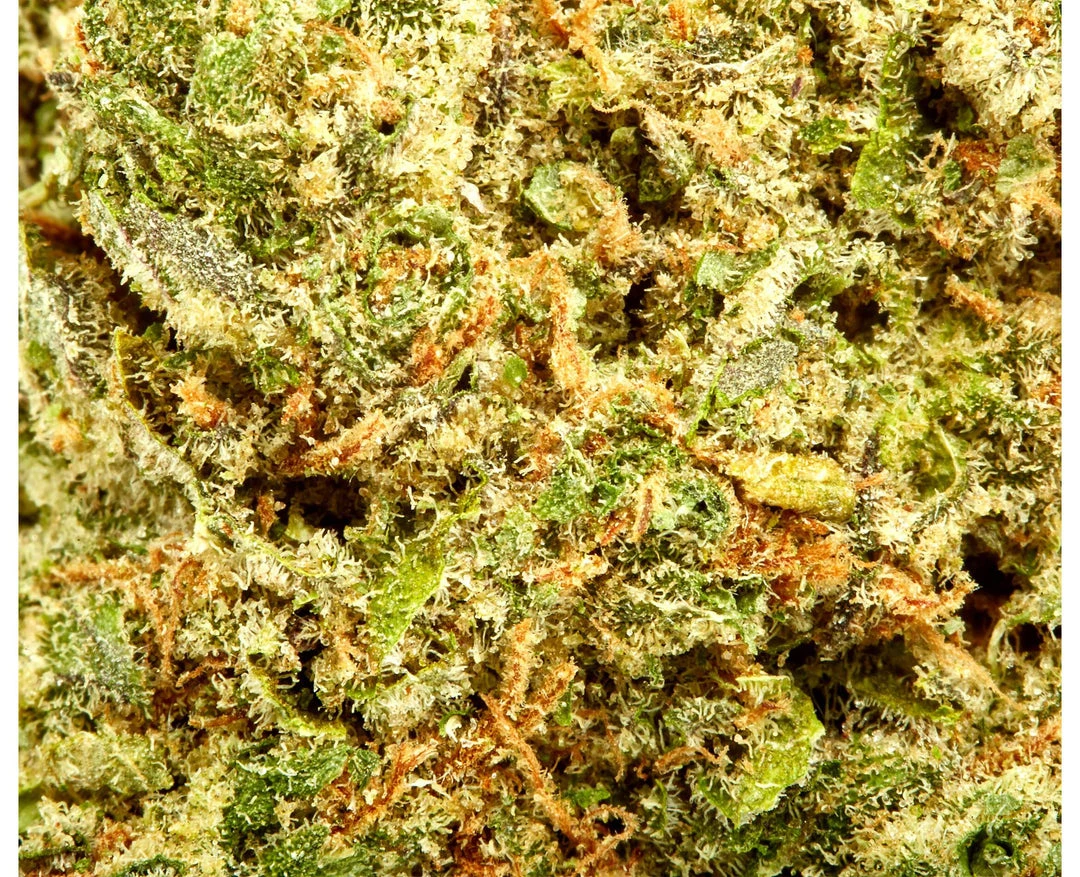 Go with the Flo. A cross between Afghani Indica and Purple Thai, this high-THC, sativa-leaning hybrid has some serious bag appeal. And it smells positively bananas, owing its sweet aroma to its unique terpene profile dominated by terpinolene and rounded out by myrcene and beta-caryophyllene. Its large spearhead-shaped buds boast a tight, dense structure flecked with copper calyxes, while its flavour is a blend of sweet citrus with earthy hints of pine.