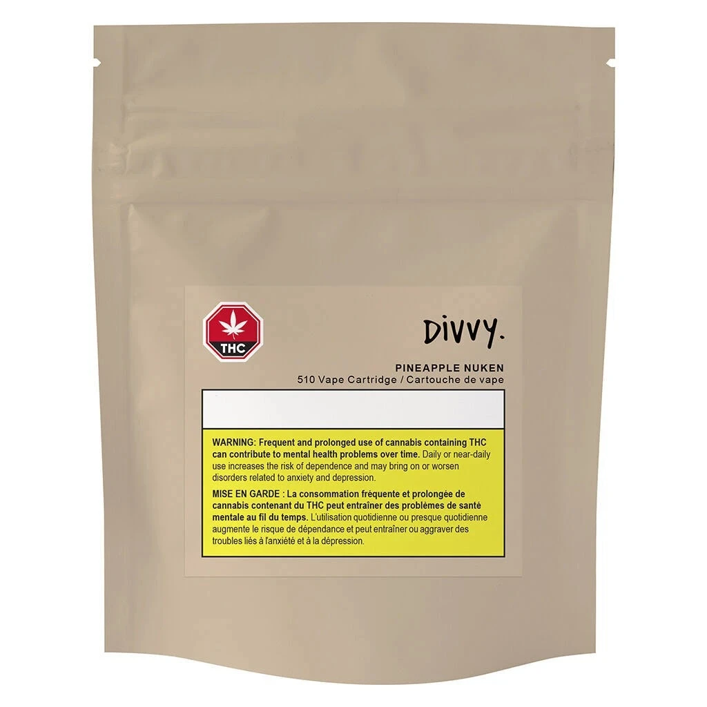 A taste of the tropics, Divvy Pineapple Nuken 510 Vapes are inspired by this tropical strain and made using COβ-extracted distillate mixed with a custom blend of botanical terps. Each cart is capped with a plastic mouthpiece and features a glass tank and ceramic heating coil that thread on to any 510 battery.