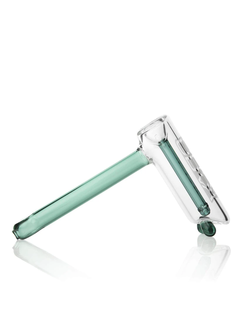 The GRAV® Hammer Bubbler is 4″ tall and made on 32mm tubing with an etch label. The body of the bubbler is clear while the mouthpiece, downstem, and feet are colored glass.