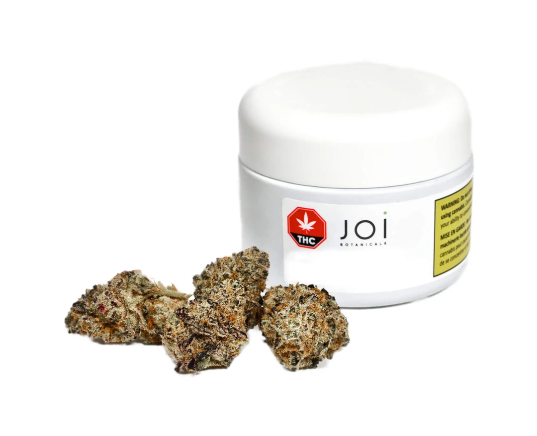 Cake Crasher #1 is a hybrid strain bred from Wedding Cake and Wedding Crasher. It boasts a strong berry and licorice aroma with slight earthy undertones. CC1 has varying terpene levels of limonene, nerolidol, myrcene, caryophyllene and pinene. This colourful flower is dense and very frosty. At Joi we hang dry hand trim and cure in stainless steel containers for at least 14 days to ensure a quality finish. Glass jars are filled by hand and include humidity packs inside to maintain optimal freshness. Enjoi.