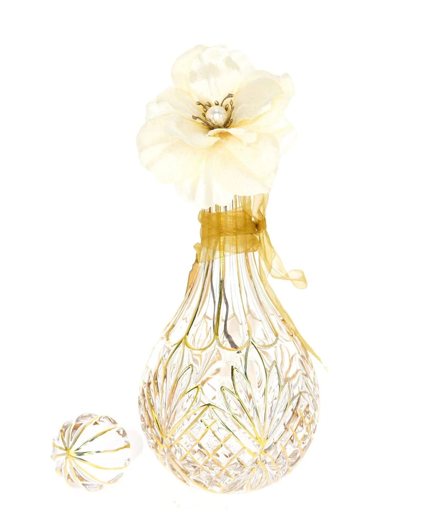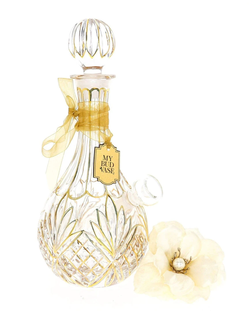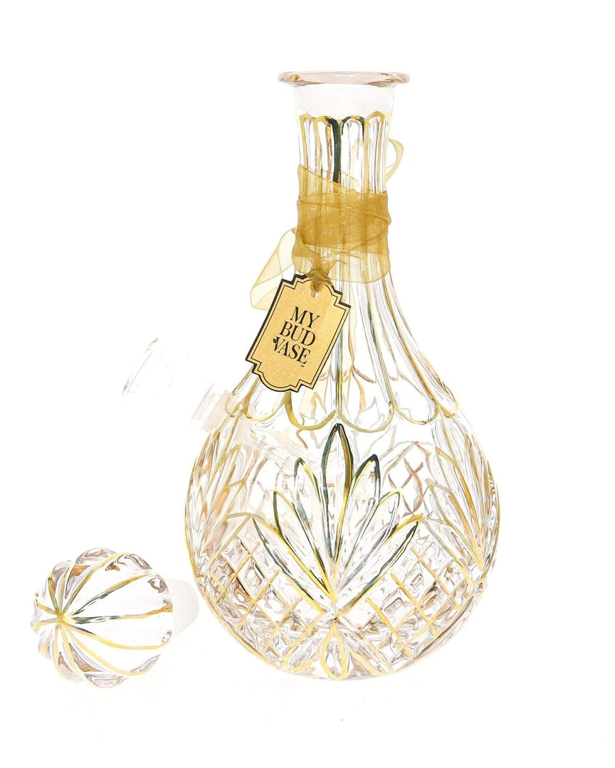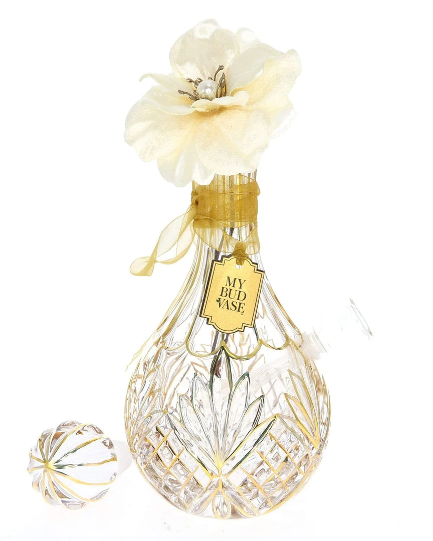 She is stardust, she is golden and she has got to get back to the garden, (or perhaps she’s got to get to the center of your holiday table) because this lovely lady will leave a lasting impression. This thick textured glass decanter features hand-painted gold detailing with a matching stopper. She comes with a large clear bubble bowl and an ivory pearl anemone flower poker. This piece is everything you’re looking for in a decorative and functional My Bud Vase to add a sparkle to yourΒ home!