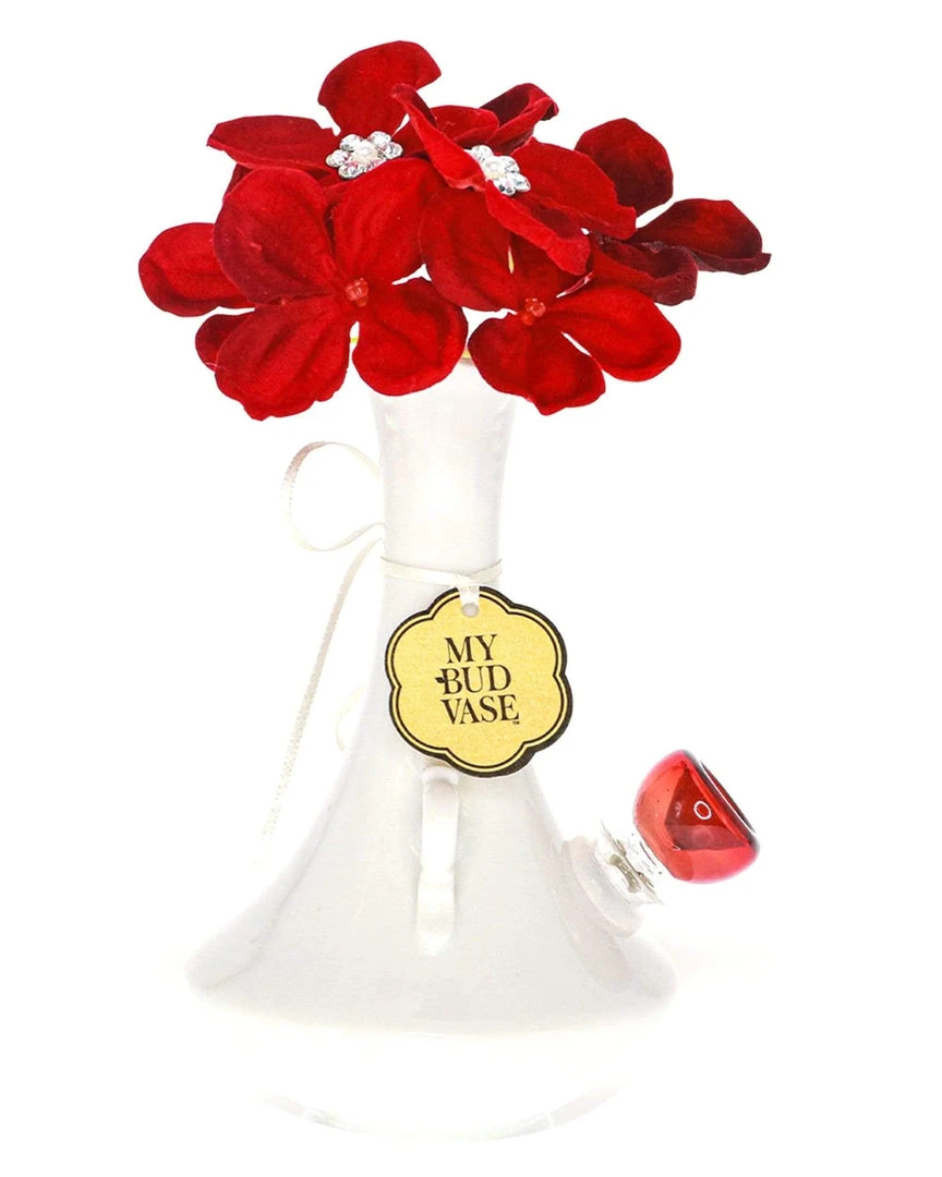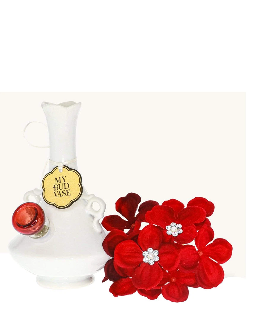 Valerie is a bell shaped beauty with a classic vase style that blends in perfectly with the everyday decor of your home. The red bubble bowl slide accents nicely against the porcelain white glass of this My Bud Vase creation and matches the rhinestone accented red velvet hydrangea flower poker perfectly.Β