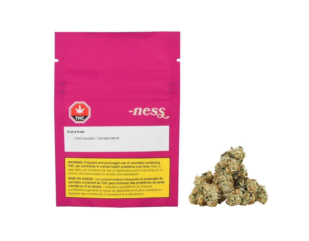 A limited-release Alberta exclusive, Guava Kush from -ness is a flavourful hybrid with high THC. Caryophyllene, farnesene and myrcene impart a unique flavour profile that’s sweet, citrus, earthy and herbal. She’s a beauty, too, boasting olive green nugs, amber hairs and a thick layer of frosty white trichomes. With legendary OG Kush and sweet Guava lineage, Guava Kush is an enchanting addition to any fruit basket. Explore Your -ness.