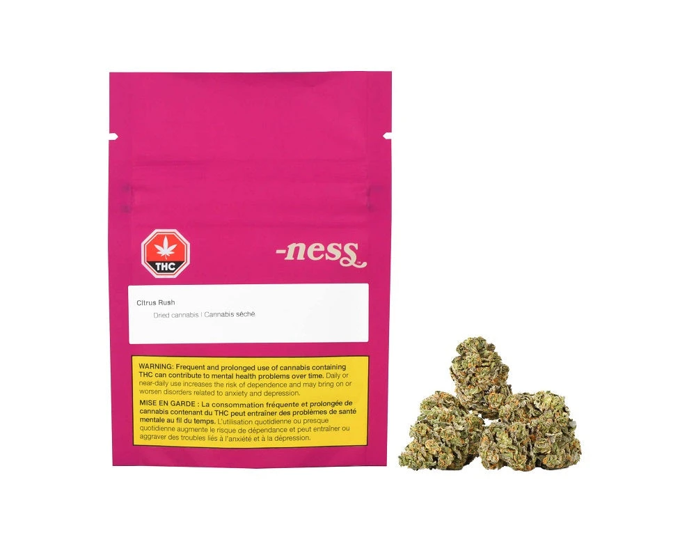 Sugary citrus, nutty cookies and a dash of earthy skunk are together at last in the unique flavour profile of Citrus Rush from -ness. An indica-dominant hybrid with high THC, this cross between Skunk Tangerine and Do-Si-Dos also brings a high terpene content, featuring terpinolene, limonene and ocimene. Not saying you need to pick up the pace to get your hands on this sweet citrus gal, but she doesn’t have rush in her name for nothing. Explore your -ness.