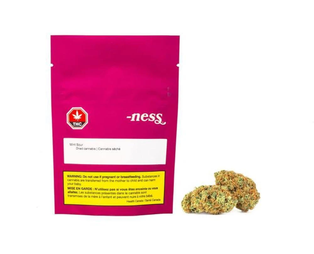 Sweet, sticky, sour, and zesty sums up this sativa-dominant hybrid strain from -ness. Also known as Mint Sour, it has a very strong THC potency potential and lineage tracing back to the legendary Sour Diesel. Its flavour and aroma come from a unique terpene profile of terpinolene, limonene and caryophyllene, and its stickiness comes from the twinkling trichomes on its dense, dark green buds. Explore your -ness.