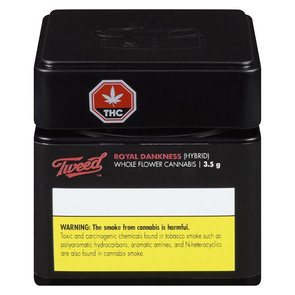 Tweed Royal Dankness is a hybrid strain with high THC and minimal amounts of CBD. Royal Dankness comes from a cross of Dancehall and Respect strains. Its buds are tight and complemented with an orange hue and dense trichome coverage. Some associate fruity, spicy and skunky flavours with the Royal Dankness strain.