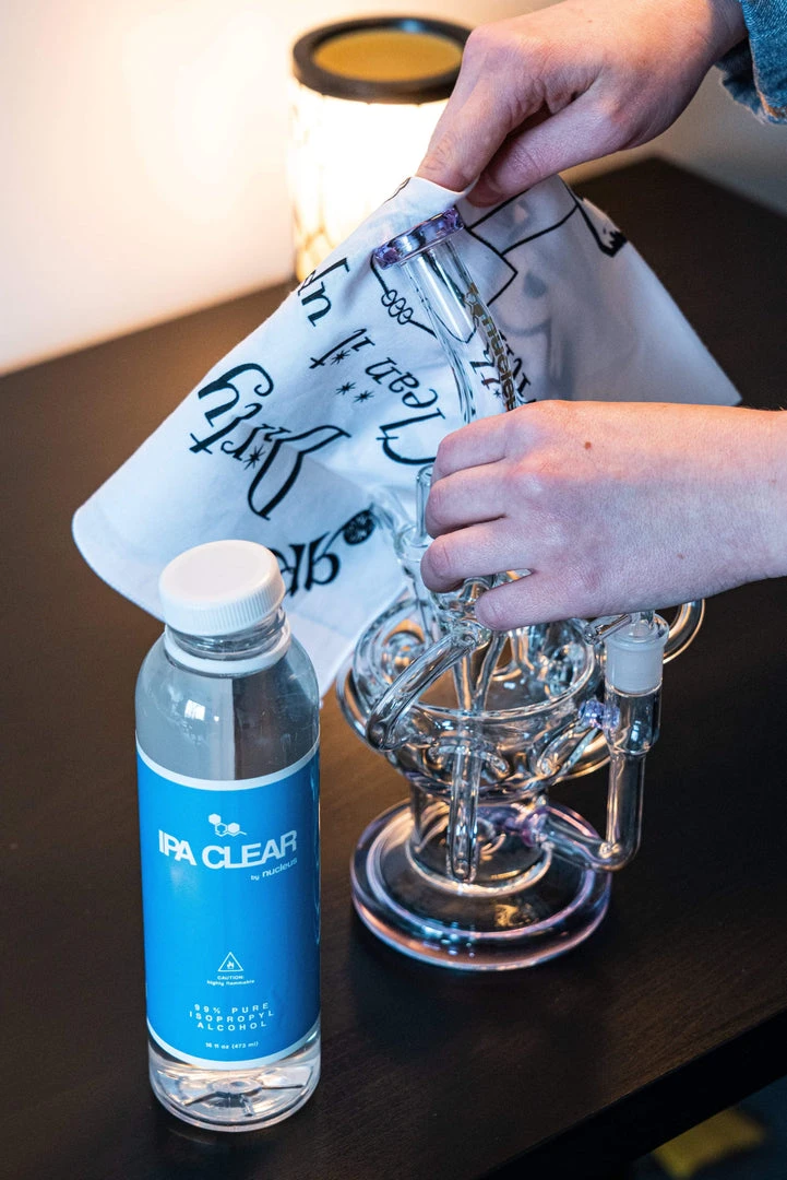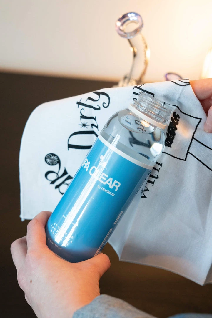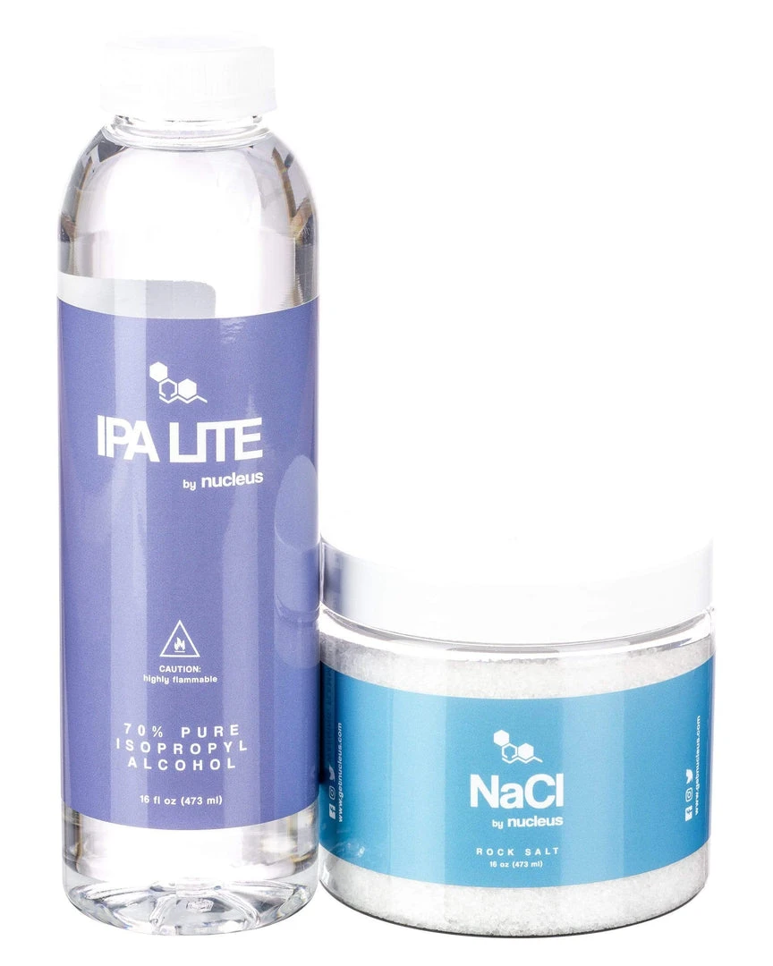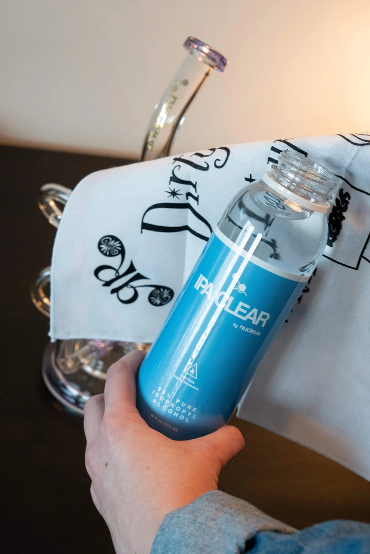 Made up of pure isopropyl alcohol, IPA Clear is a great solution for grimy bongs and glass. First add salt, preferably coarse salt like NaCl by Nucleus, then pour in IPA Clear. Plug up any openings and get to shaking. You will be able to see the residue rubbing off as you shake. Pour out and rinse your piece for a spotless water pipe. Each bottle of “IPA Clear” Pure Isopropyl Alcohol comes in 16 fl oz.