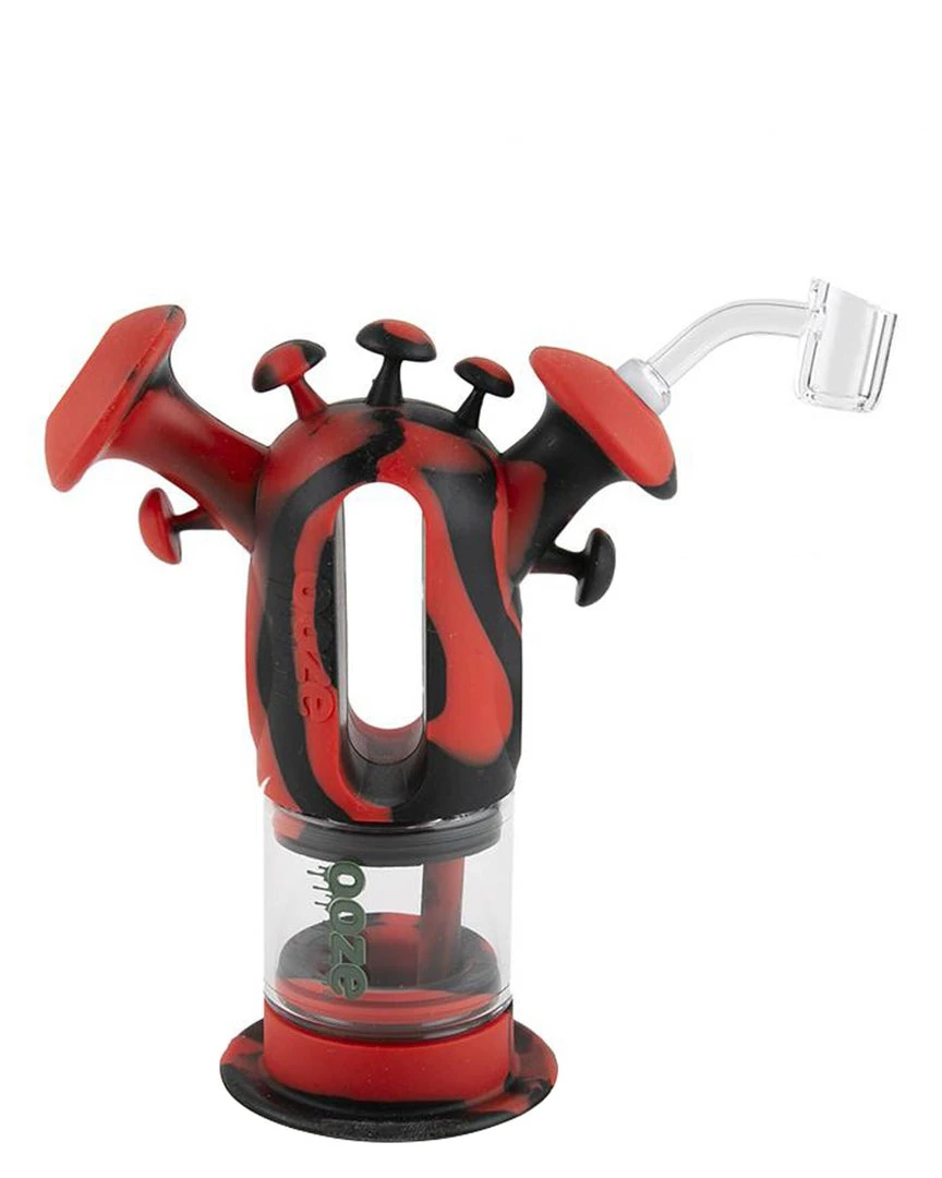 Woah! Is probably the first thing you said looking at the Trip waterpipe from Ooze. This multifunctional bong and dab rig combo is wonderfully functional and looks like it jumped out of a Doctor Seuss book with what appear to be little mushroom caps sprouting all about. The larger two plumes feature a mouthpiece and 14mm female joint that is placed over a silicone downstem. Pick your potion and watch as the smoke is filtered through a trippy center viewing chamber before filling your lungs!