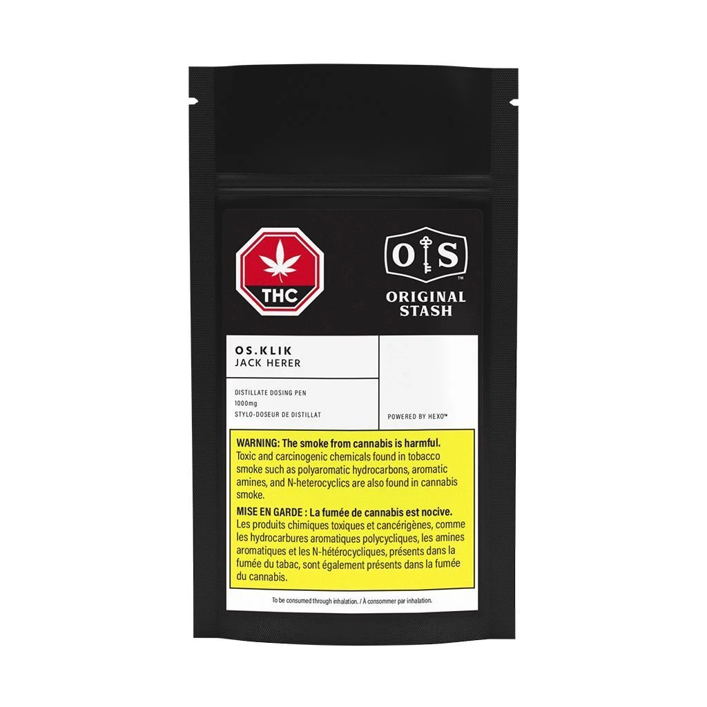 Exclusive to Canada, OS.KLIK is an easy-to-use distillate dosing pen for dabbing and other concentrate uses. The OS.KLIK applicator provides consumers with precision dose control and a mess-free, portable, and discreet concentrate experience. Each audible “click” from the applicator dispenses 25 mg of the OS.KLIK Durban, a sativa cannabis distillate featuring terpenes including caryophyllene, humulene and limonene. The distillate can be inhaled or ingested and does not contain any additives, diluents, pesticides or heavy metals – just distillate and terpenes. Each OS.KLIK applicator will dispense approximately 40 KLIKs.