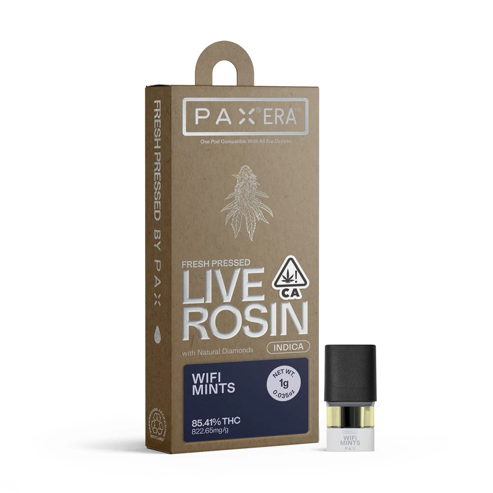Wifi Mints (or Wifi Mintz) is an indica-dominant hybrid cross of White Fire and Animal Mints. The strain has a distinct floral aroma with notes of spice and diesel from its GSC lineage, topped with a sweet mint finish.. A great nighttime strain, Wifi Mints promotes a cerebral yet relaxing experience. Caryophyllene, a lead terpene, is present in many spices and herbs, including black pepper, basil, and oregano. Its spicy, funky warmth on the nose is similar to cinnamon and cloves. Interestingly, it has an ability to interact with CB2 receptors in the endocannabinoid system to stimulate relieving effects. Available in 0.5G and 1G PAX Era pods.