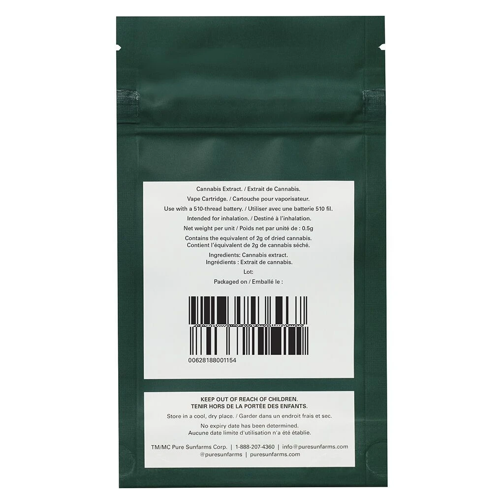 Pure Sunfarms’ 510 vape cartridges are filled with 0.5g of full-spectrum, single-strain, whole bud extracts – and nothing else. Just pure BC cannabis, providing smooth flavour with every pull. Critical Kali Mist showcases aromas and flavours of dill and parsley (pinene), raspberry and orange sorbet (myrcene), and oregano (caryophyllene), carefully preserved from the original BC grown flower. Fitted with a custom ceramic mouthpiece, and featuring a glass tank and ceramic heating coil, every component of Pure Sunfarms’ cartridges is thoroughly tested for quality and safety. Compatible with a 510 thread battery.