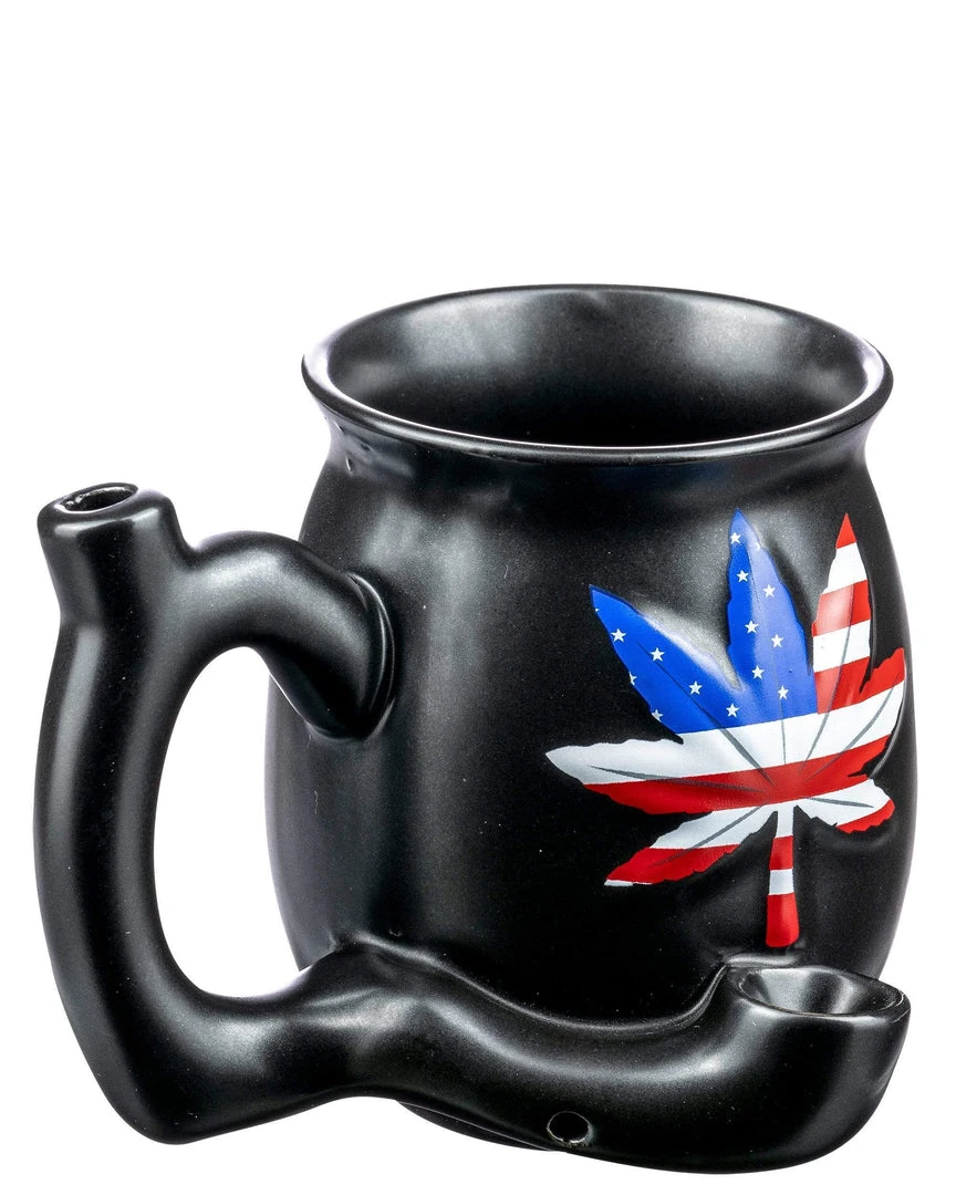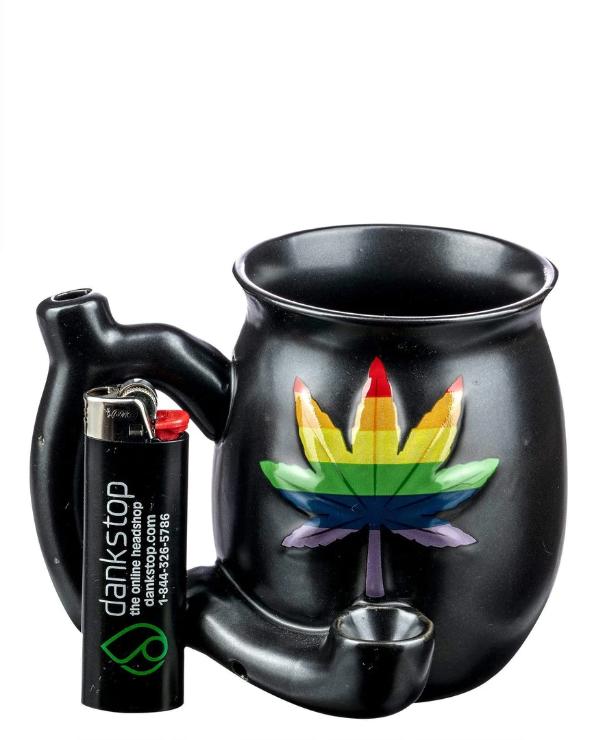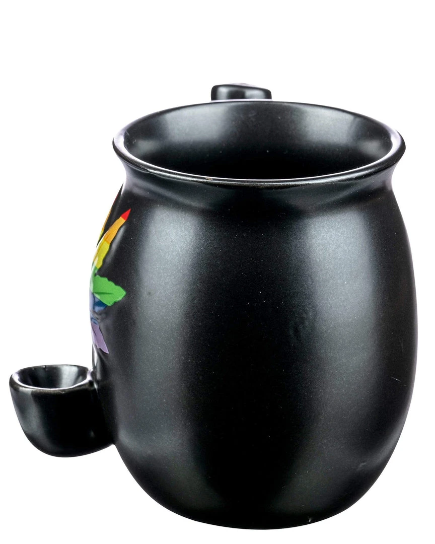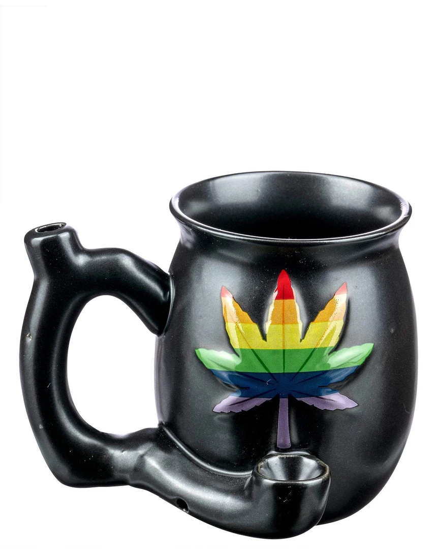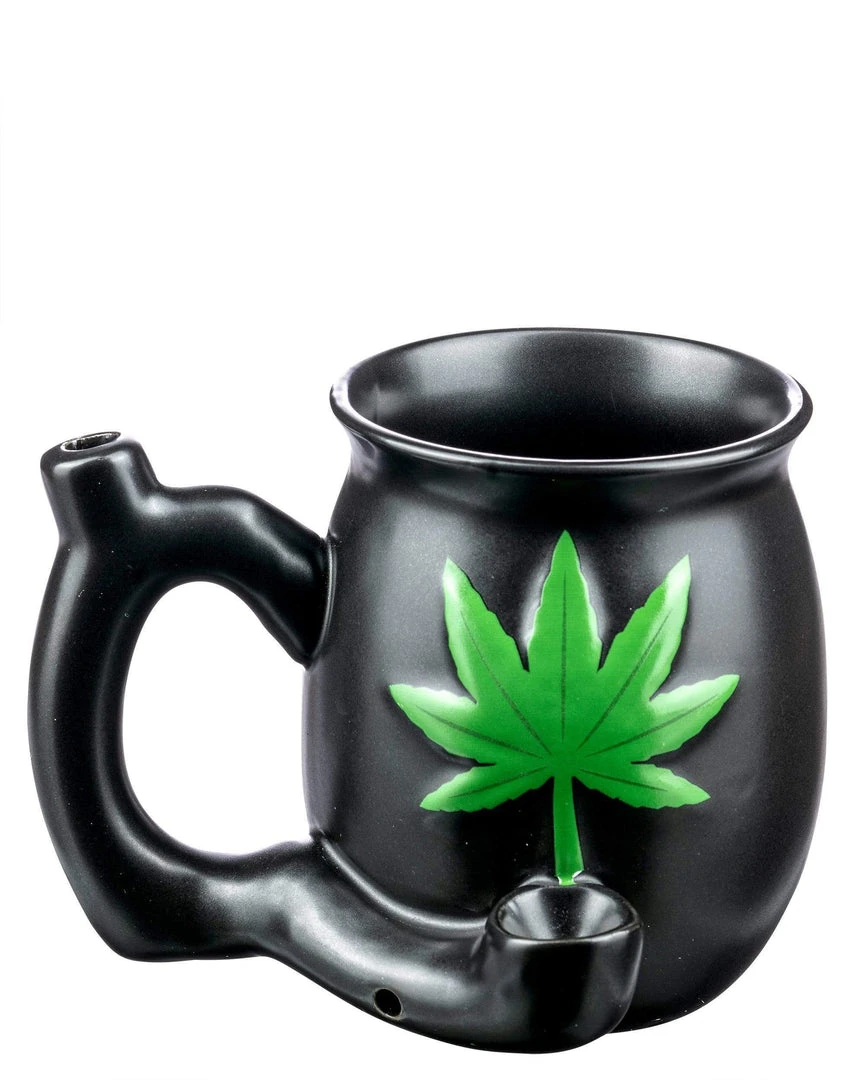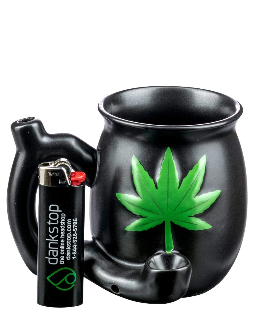 Hand made from quality kiln-fired ceramic, each of these Premium Roast & Toast Small Pipe Mugs feature a 3D molded Cannabis leaf on the mugs front face, an 11 fluid ounce cup, and a separately functioning sherlock spoon pipe built into the handle. At the top of the mugs handle you’ll find the hand pipes mouthpiece and on the righthand side of the deep bowl is a carb hole used to control smoke during inhalation. When the time comes, just wash these premium pipe mugs the same way you’d clean any other ceramic cup or bowl in your collection, Roast & Toast Pipe mugs are both dishwasher and microwave safe!Β