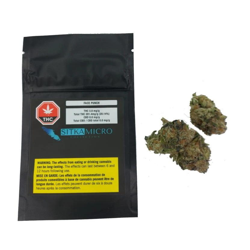 Face Punch is an indica-dominant hybrid cross of Purple Punch and Animal Face. Its long, conical buds are tightly wound with extensive trichome coverage and auburn pistils poking through the lime-coloured buds with splashes of army green. The nose has notes of floral sweetness and citrus. These aromas follow through in the smoke flavour, with a delicate undertone of pine and conifer with a slightly spicy exhale. It has a terpene profile of alpha-humulene, beta-caryophyllene, and limonene. .