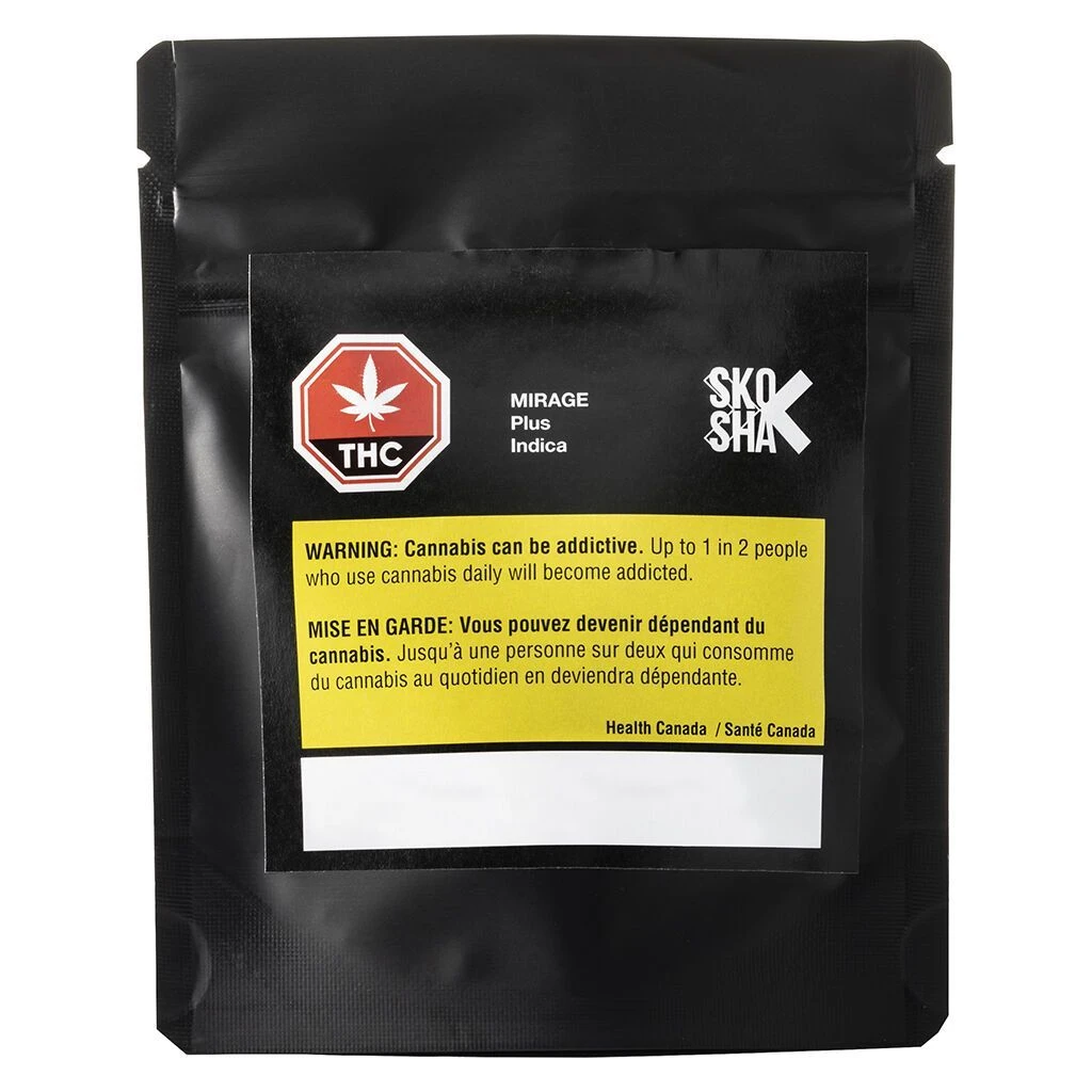 Mirage Plus by SKOSHA is an indica-dominant strain. This bud is lightly trimmed and handled carefully throughout the harvest process to protect trichomes and terpenes. Expect a strong earthy aroma with hints of spice and citrus within the large dense flower. Itβs available in various dried flower sizes and pre-rolls. This flower produced by SKOSHA is packaged in a moisture-locking bag and is non-irradiated.