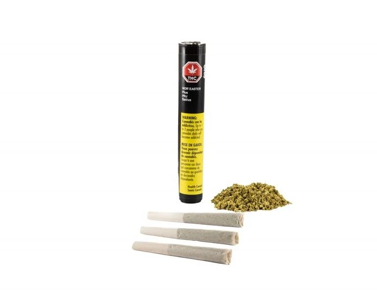 SKOSHA Nor’Easter Plus is sativa-dominant and high THC, offering pleasant aromas of citrus, pine and spice. Named with respect to the powerful storms on Canada’s east coast, these pre-rolls are made with resinous whole flower, carefully milled and feature a folded tip. Nor’Easter Plus is available in pre-rolls and various dried flower sizes. This product, produced by SKOSHA, is milled whole flower, not shake, packaged in a recyclable tube and is non-irradiated.