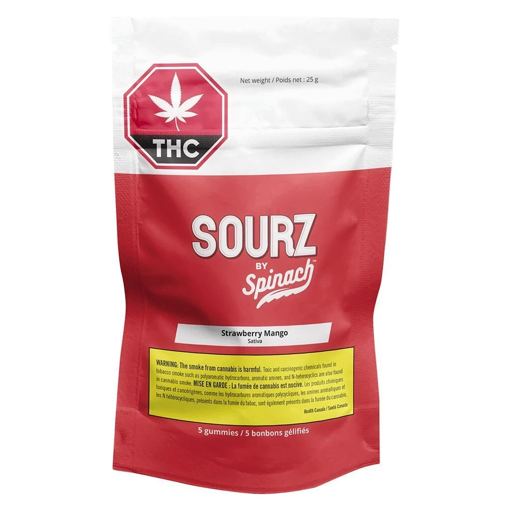 What happens when you mix luscious strawberry and tropical mango flavours? You get a thundering burst of flavour with Strawberry Mango SOURZ by Spinachβ’. This dual-flavored soft chew blasted with sour crystals is over-the-top with only natural flavours and colours. With 5 big βSβ gummies per pack, you and your friends can enjoy more SOURZ by Spinachβ’ in one sitting. 10 mg THC total per pack.